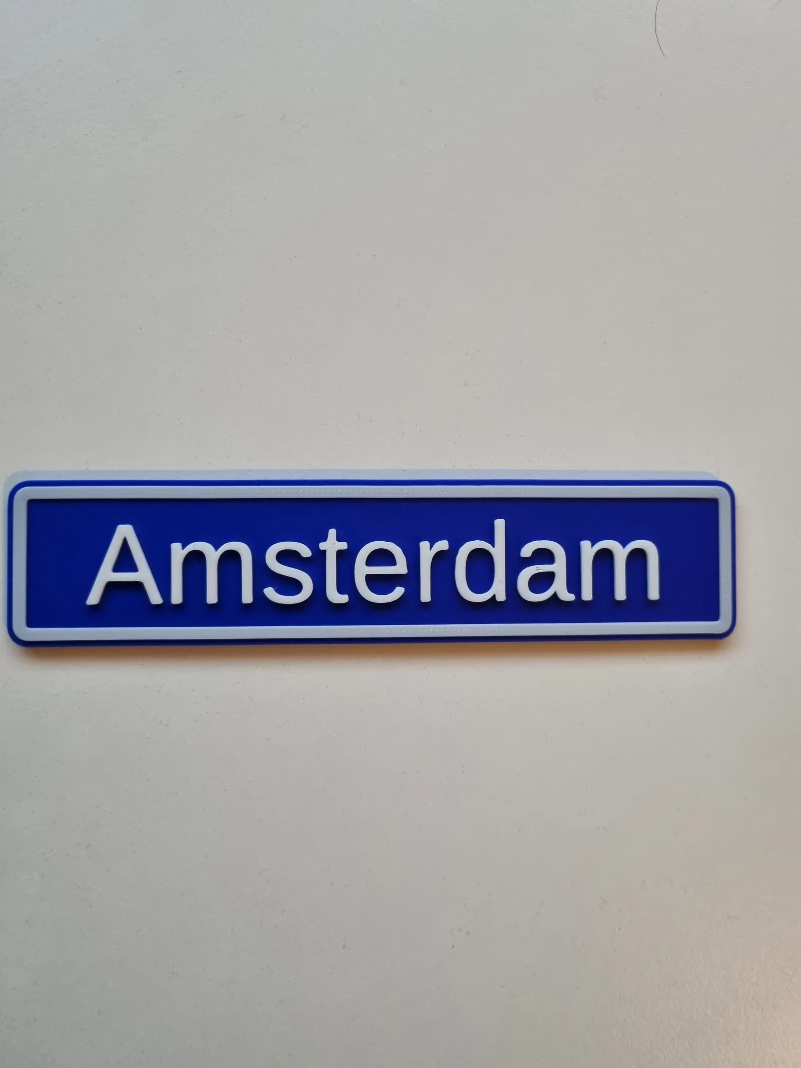 Mẫu bảng tên thành phố Amsterdam để in 3D, kiểu bảng chỉ dẫn gọn đẹp với viền nổi và chữ nổi. Có thể tuỳ biến thành phố/kích thước qua CitySign Generator, kèm tuỳ chọn lỗ bắt vít cho diorama, trang trí hoặc quà tặng.