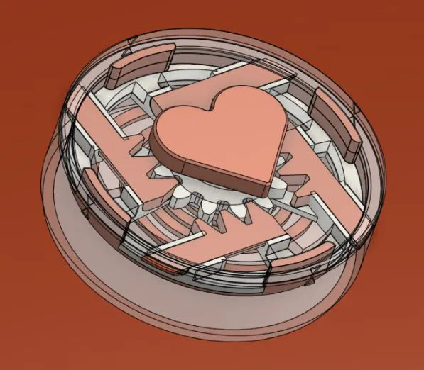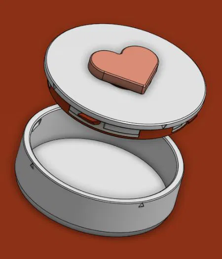 Hộp nhỏ hình trái tim có cơ chế khóa gài bằng lò xo và bánh răng, dùng để đựng quà hoặc vật dụng lặt vặt dịp Valentine. Lắp ráp theo hướng dẫn để các rack trượt mượt và nắp đóng mở chắc chắn.