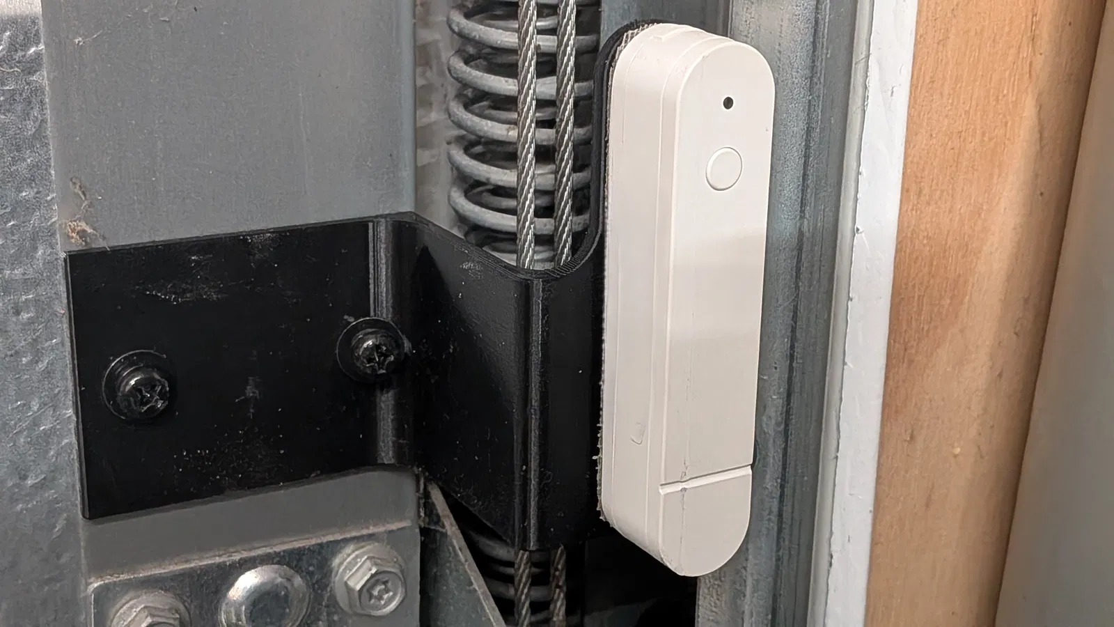 Bản remix giá gắn cảm biến cho IKEA Mygbett (Matter) dùng với cửa cuốn trần Hörmann. Tận dụng 2 lỗ sẵn gần bản lề để bắt bulông; phần nam châm có thể dán băng keo 2 mặt hoặc canh rail rồi dán super glue.