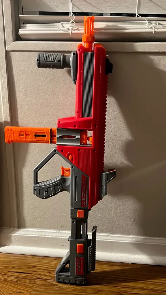 Hình chụp là của một phiên bản cũ hơn, lúc đó chưa có phần gân/đỡ nối giữa hai trụ trước và sau. Nhưng khác biệt thực sự giữa bản đó và bản này chủ yếu là: với bản mới, khi gắn adapter mà không gắn mag thì gần như không thể nạp từng viên dart đơn lẻ do có phần đỡ. Theo mình thì đánh đổi vậy cũng ổn, vì nó đỡ bị gãy/dễ hư hơn.