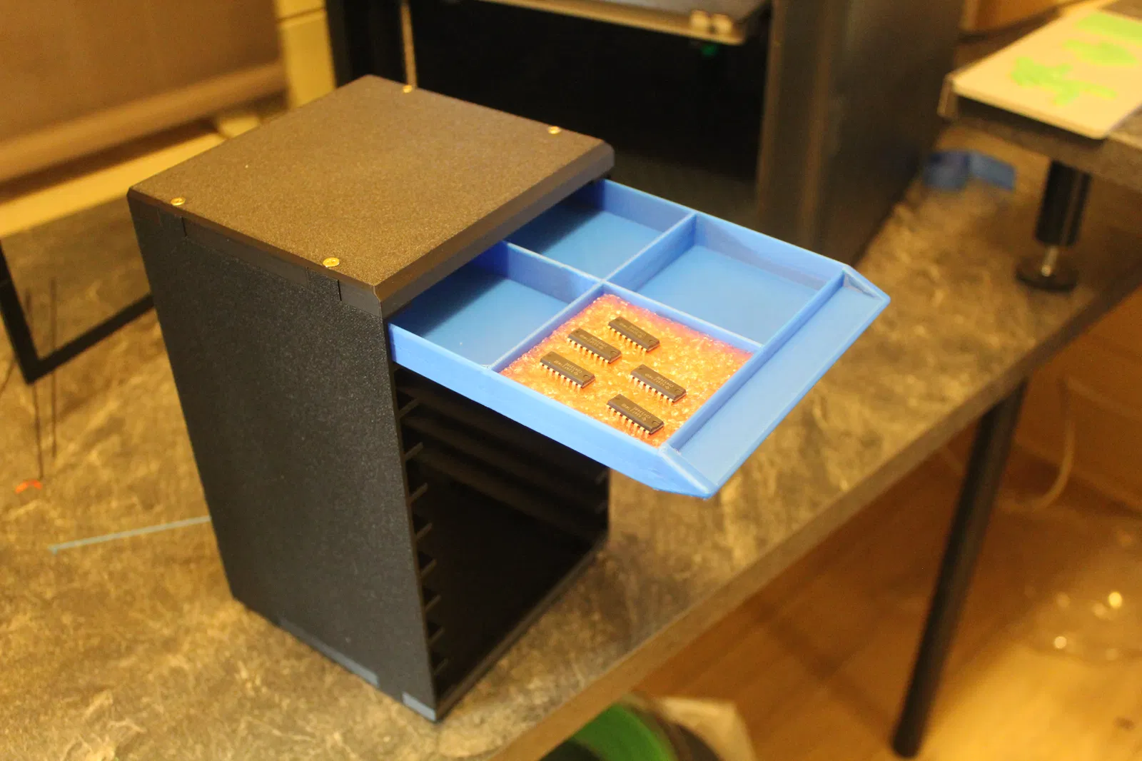 Khay sắp xếp IC kích thước 23,5 (C) x 14,5 (R) x 16 (S) cm. Gồm 10 ngăn kéo: loại chia 4 ô, chia 2 ô hoặc để trống không chia. Lắp ráp cần 8 vít tự ren 3x10mm.