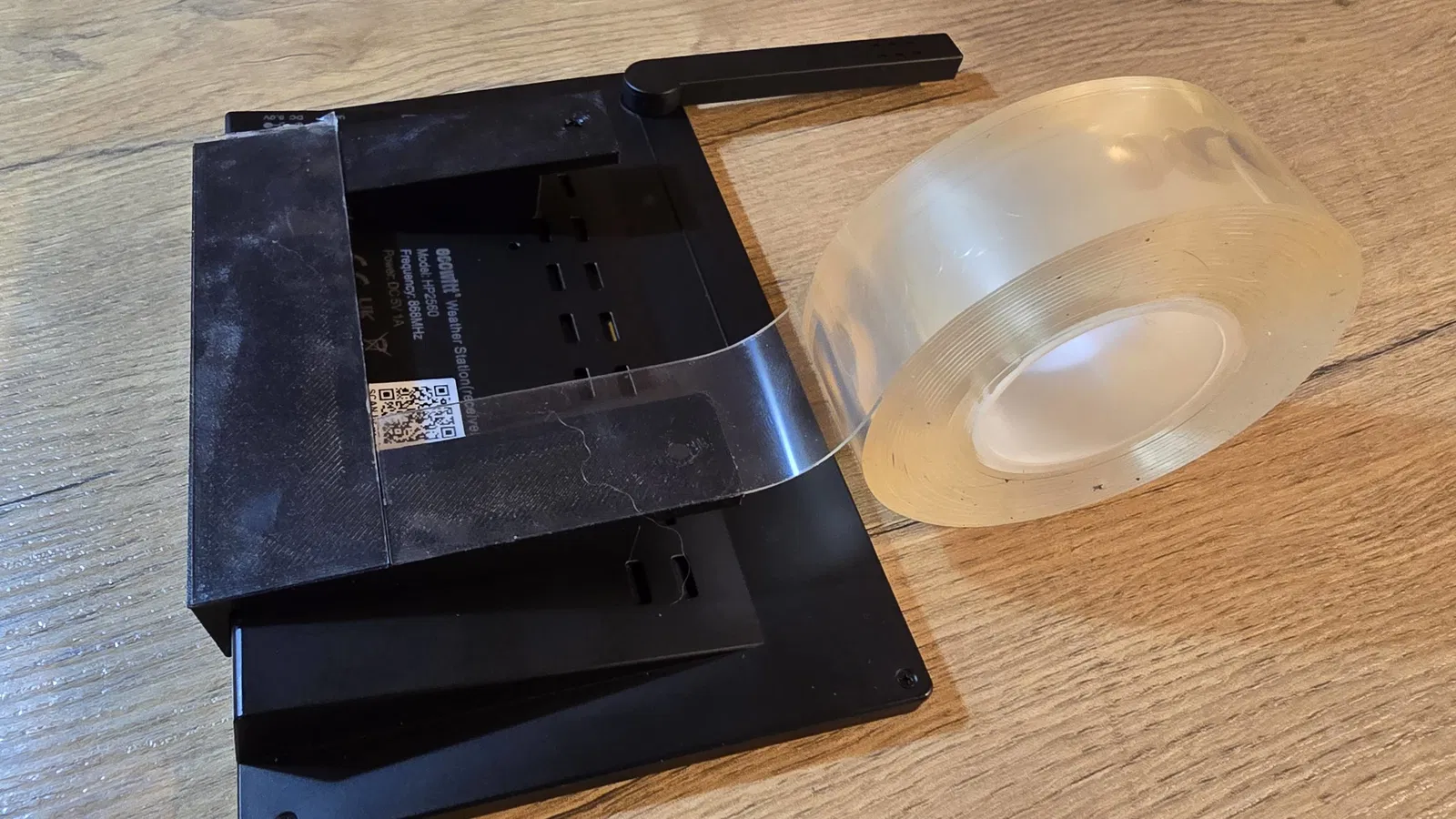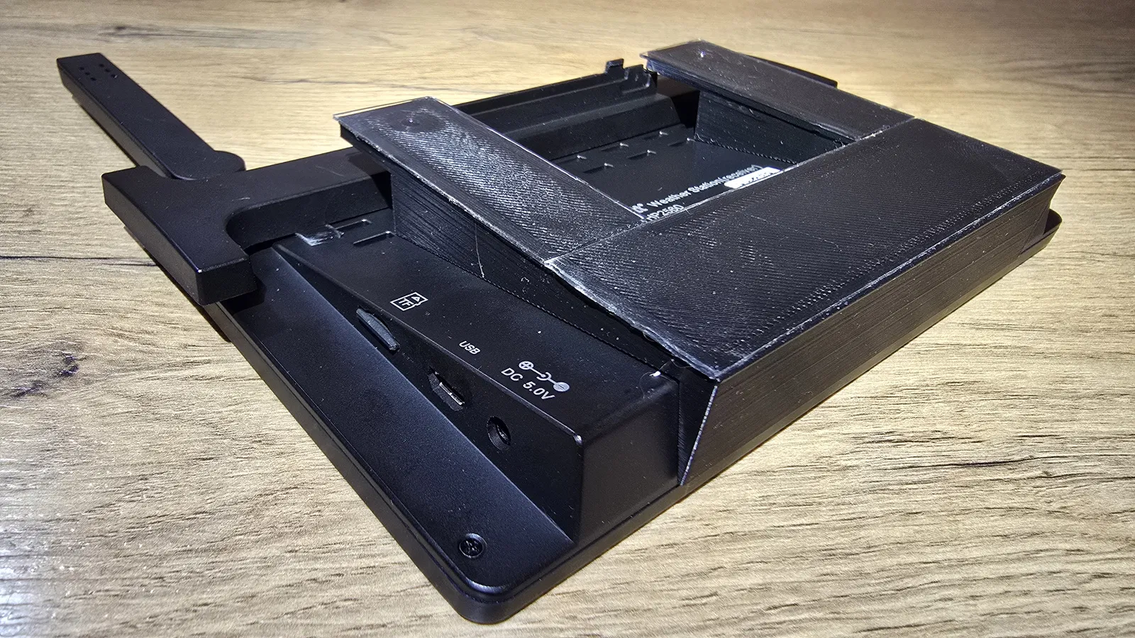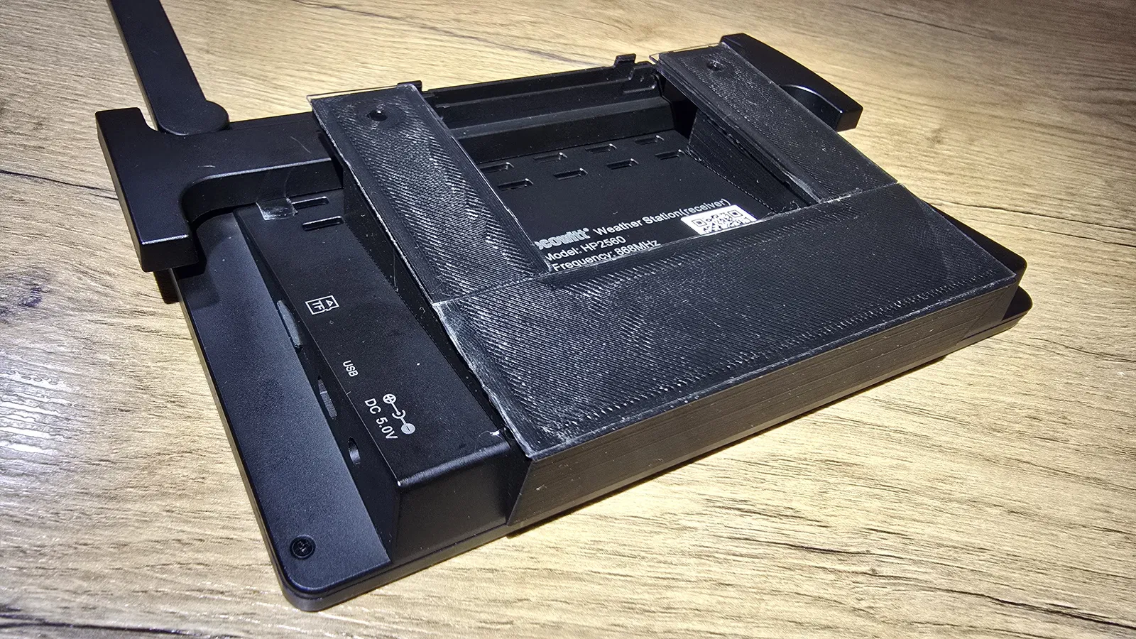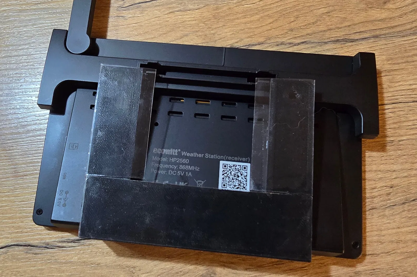 Ngàm treo tường vừa khít cho Ecowitt HP2560 & Froggit HP2000: giữ chắc, góc nhìn tối ưu, vẫn thao tác được cổng nguồn/khe SD và có chỗ cất chân đế zin. Khuyến nghị in PETG, infill 15–20%, không cần support.