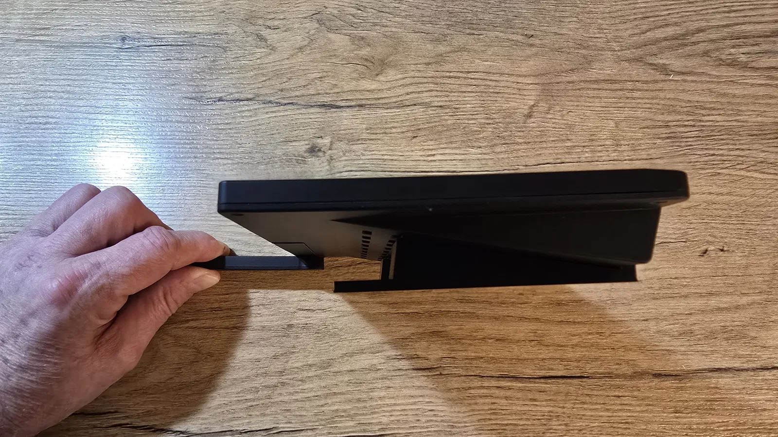Thiết kế được làm sao cho bạn chỉ cần trượt console từ phía trên xuống vào rãnh dẫn hướng. Nhờ góc nghiêng được canh chuẩn, màn hình vẫn dễ đọc, trong khi các cổng kết nối (nguồn, khe SD) ở bên hông vẫn thoải mái thao tác. Ngoài ra còn có chỗ để cất chân đế zin để khỏi bị thất lạc.