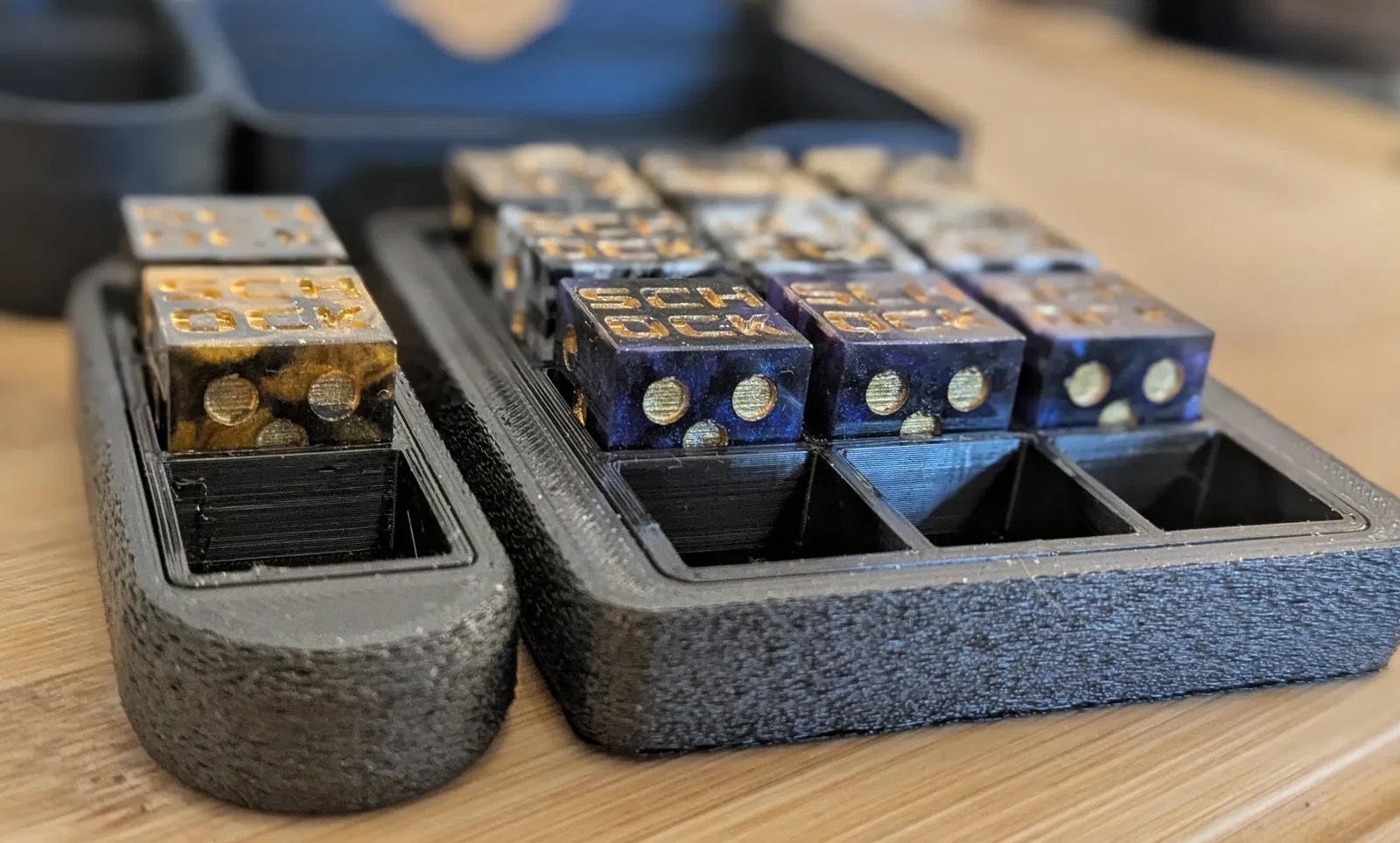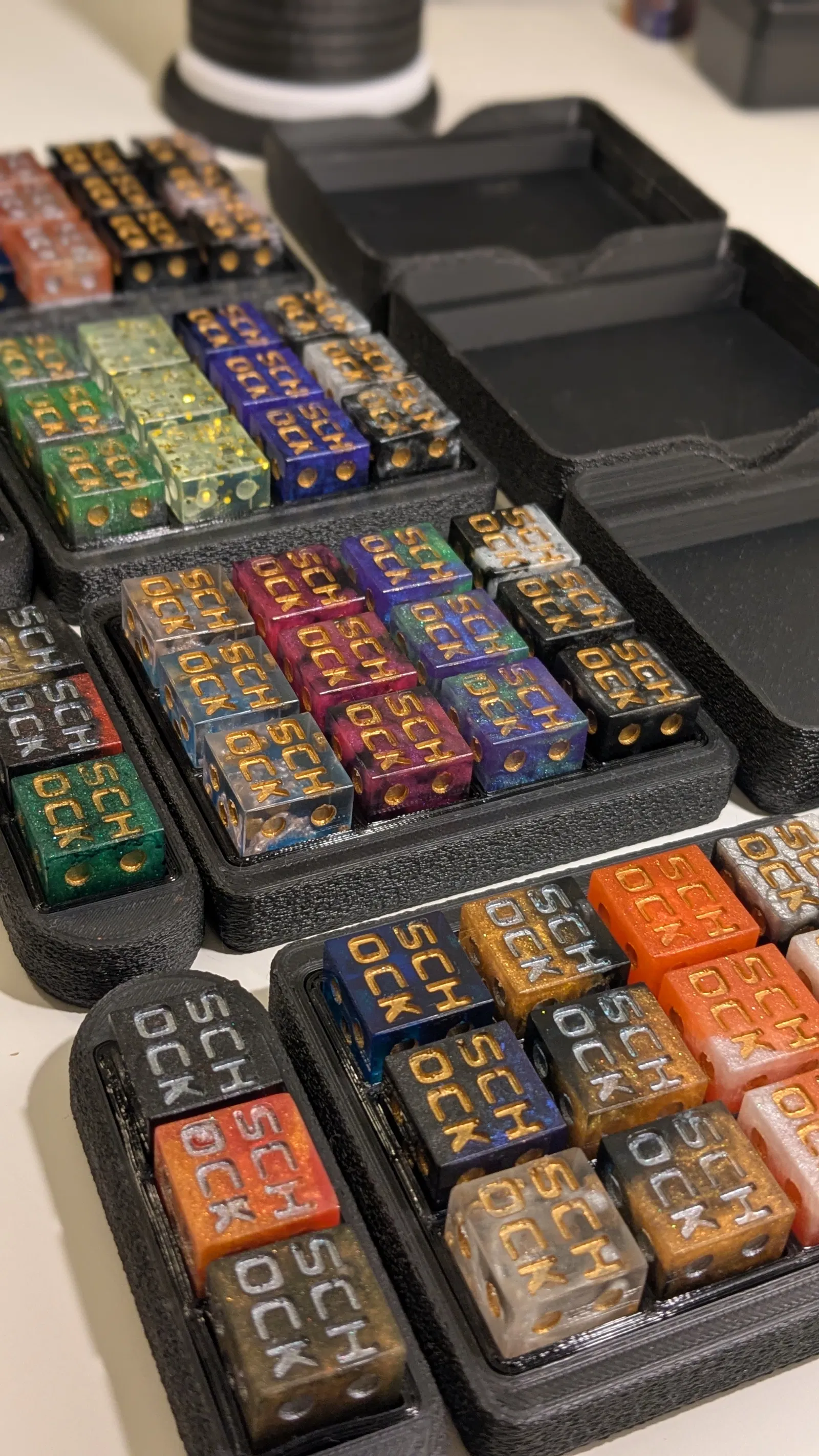 Bộ xúc xắc cho trò Schocken: in master dice, làm khuôn silicone (mold housing/cap mold), rồi đổ epoxy resin ra xúc xắc thành phẩm. Kèm hướng dẫn chà nhám, tô số, và hộp đựng có nam châm tùy chọn.