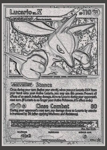 Mẫu Lucario LV X TCG dành cho fan Pokémon/TCG, phù hợp để trưng bày hoặc làm phụ kiện liên quan đến thẻ bài. Thiết kế theo phong cách card art, tiện để in 3D và sưu tầm.