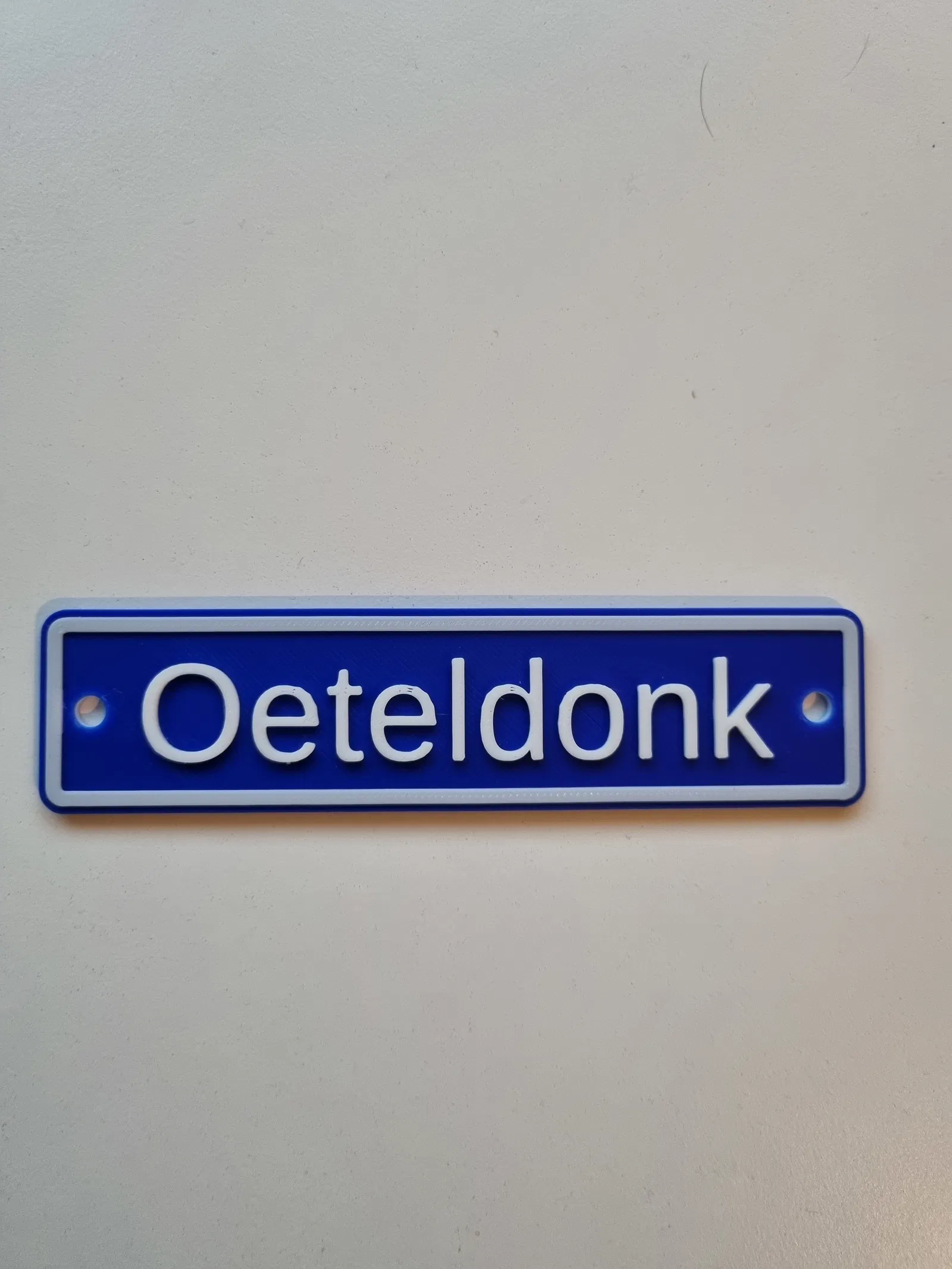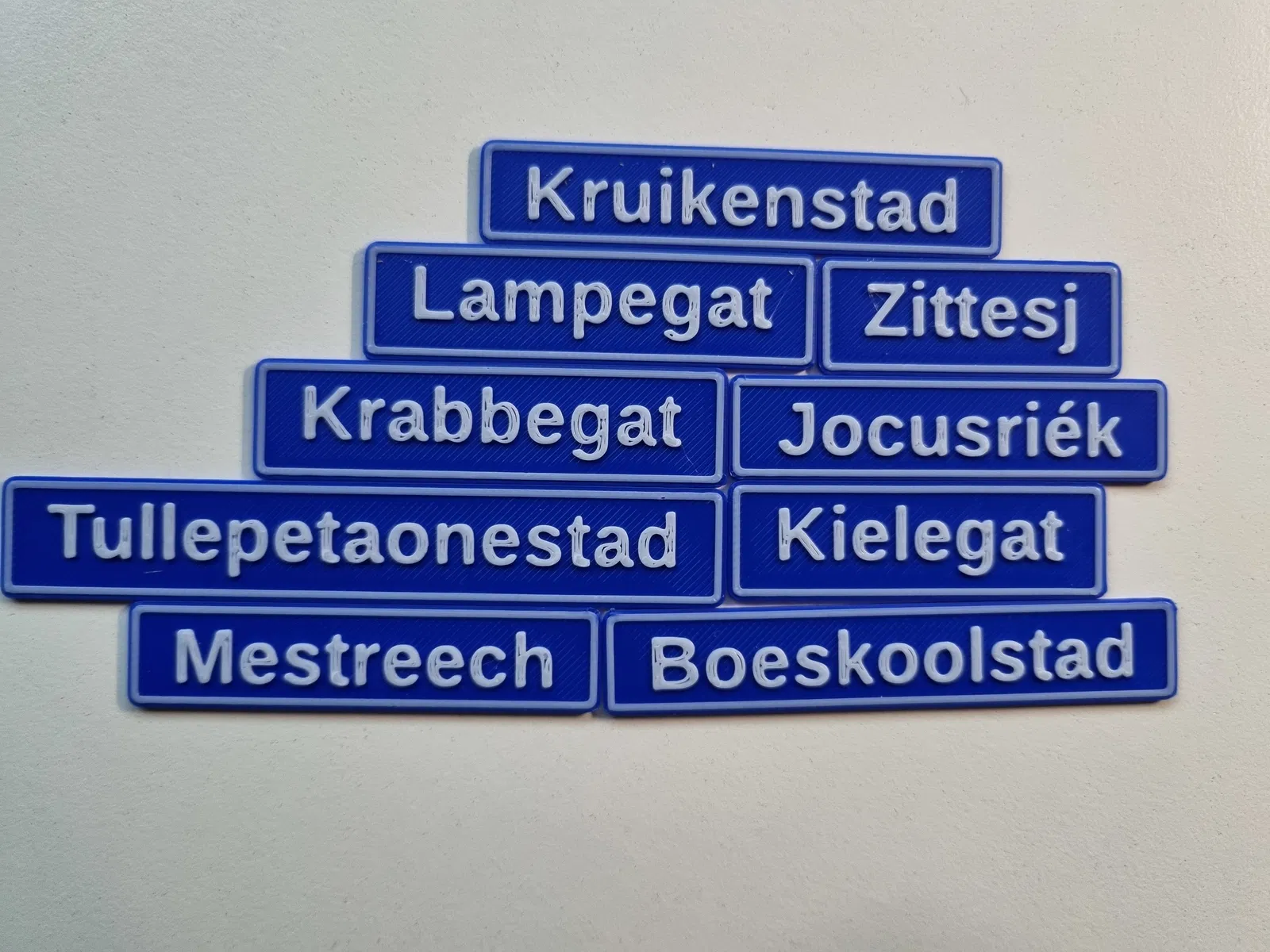 remark: phần màu trắng trong hình ví dụ có đủ tên nhìn không được sáng lắm là do bị resize. Mình đã scale model xuống còn 40% để in nhanh hơn. Nếu bạn in đúng kích thước gốc thì sẽ sáng như bản in của Oeteldonk. Việc resize bạn cũng có thể dùng citysign generator; nó sẽ thay đổi kích thước tấm bảng, không thay đổi chiều cao font.