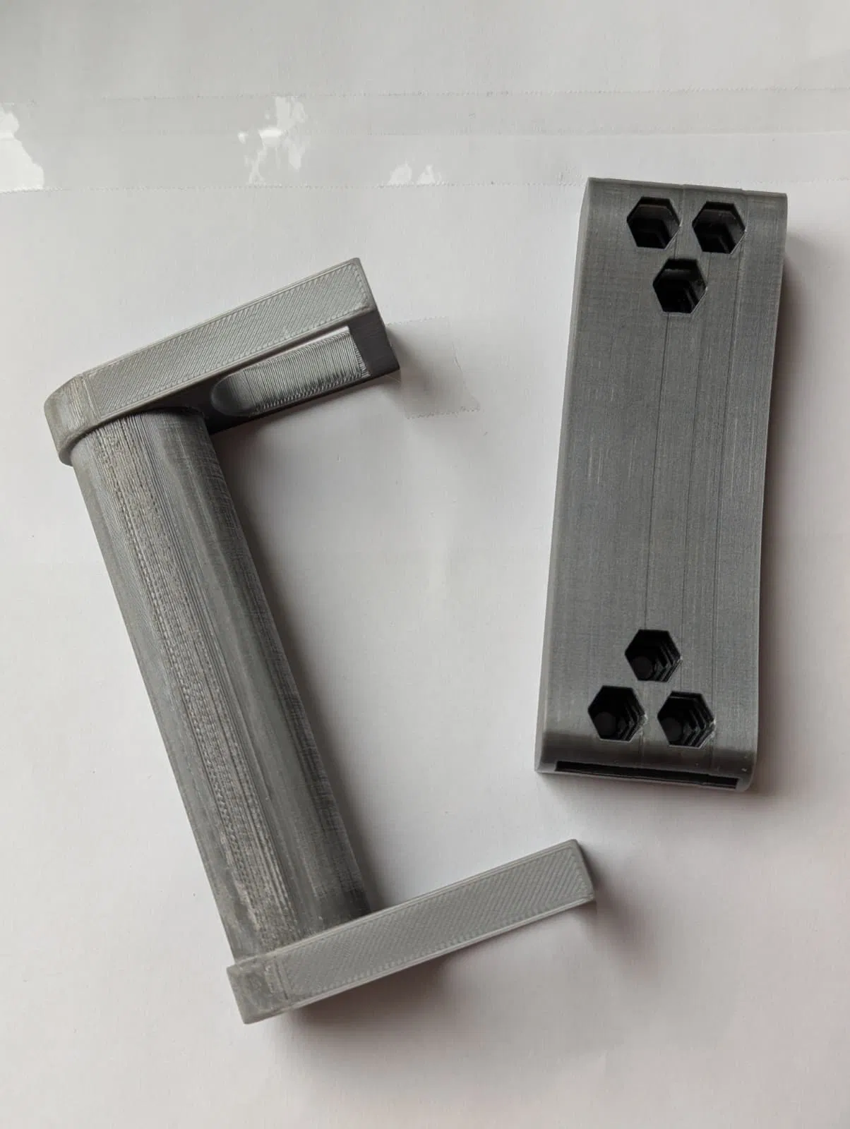 Bộ tay cầm và ngàm gắn tay (arm mount) cho khiên cosplay/khiên gỗ tự làm. Gắn lên khiên bằng tán và bu lông M4. Dây đeo tay dùng PU-leather 25mm với snap fastener; tay cầm cũng quấn PU-leather.