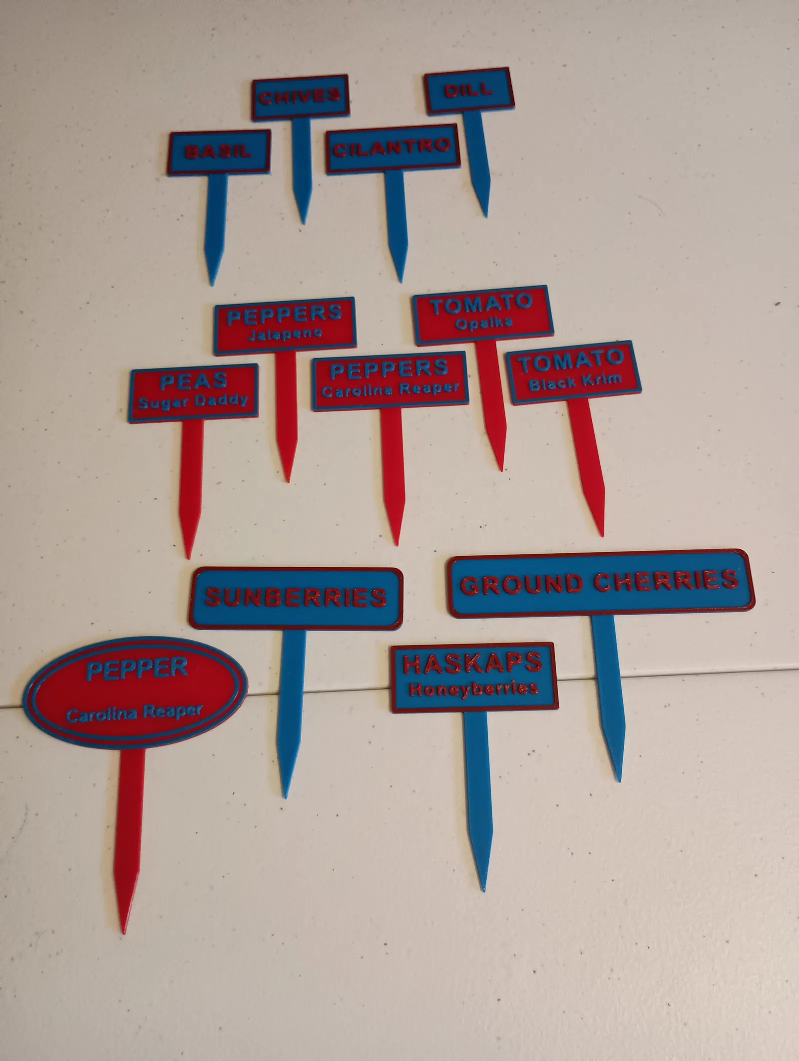 Bộ cọc nhãn cắm vườn dạng parametric: nhiều mẫu sẵn in, đổi màu theo layer nên không cần AMS/MMU. Có file OpenSCAD để tự tạo nhãn theo ý, kèm .3mf Bambu Studio và gợi ý in PETG 0.2mm.