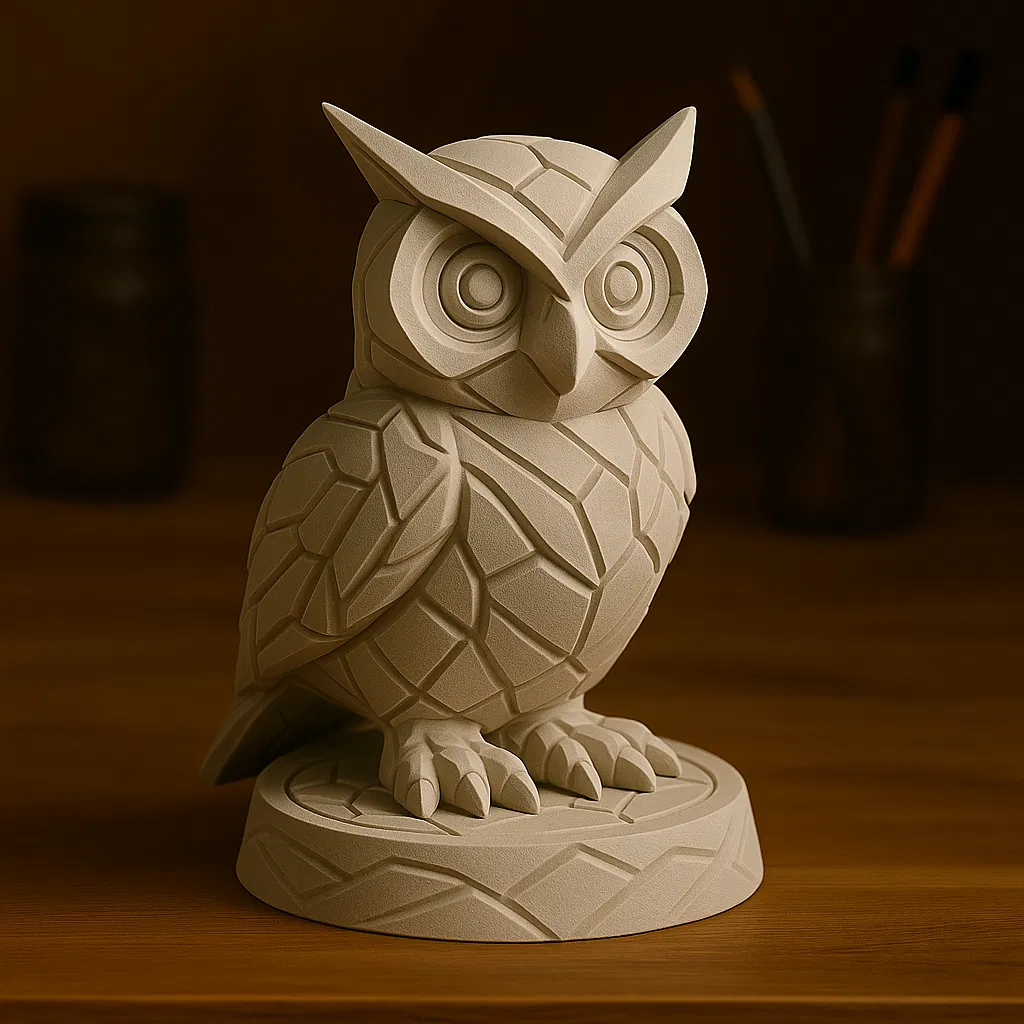 Tượng cú mèo low-poly phong cách hiện đại, với các mảng hình học gọn gàng và đôi mắt to, biểu cảm nổi bật.