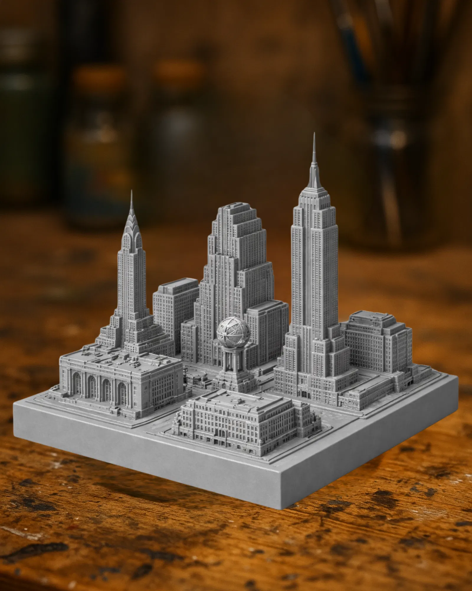 Mô hình skyline thu nhỏ cực kỳ chi tiết, tái hiện các tòa nhà chọc trời mang phong cách New York biểu tượng, được sắp xếp trên một bệ vuông đặc chắc chắn.