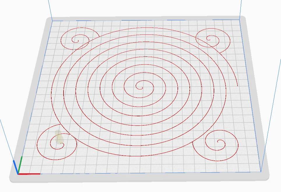 Bài test cân chỉnh mặt bàn in (bed level) siêu nhanh, kích thước khoảng hình vuông 200mm. Nhờ thiết kế spiral và khoảng cách line, mẫu này in khoảng 2 phút ở 50mm/s, phủ được phần lớn mặt bàn in với lượng vật liệu ít nhất có thể.
