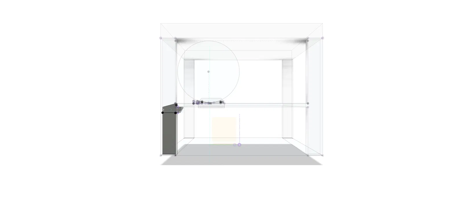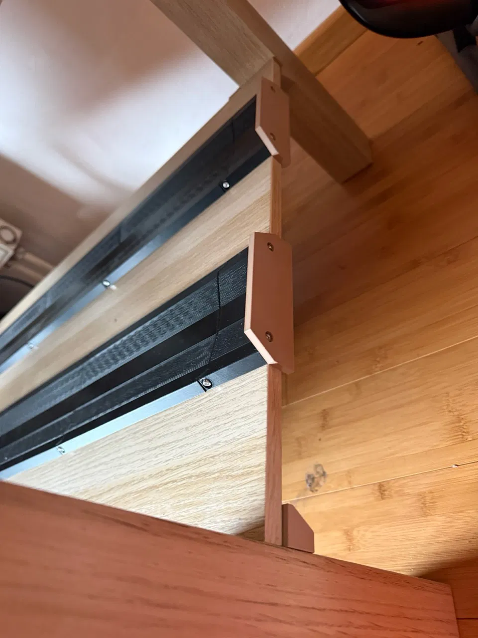 Gia cố và chỉnh sửa đơn giản cho bàn IKEA LACK bản rộng (90 cm). Kệ bên trong được hạ thấp để có thể sắp xếp các cuộn filament nằm cạnh nhau. Đồng thời thêm chân phụ để đỡ trọng lượng filament lưu trữ bên trong. Khi gắn các corner mount, nhớ dùng bản template định vị.