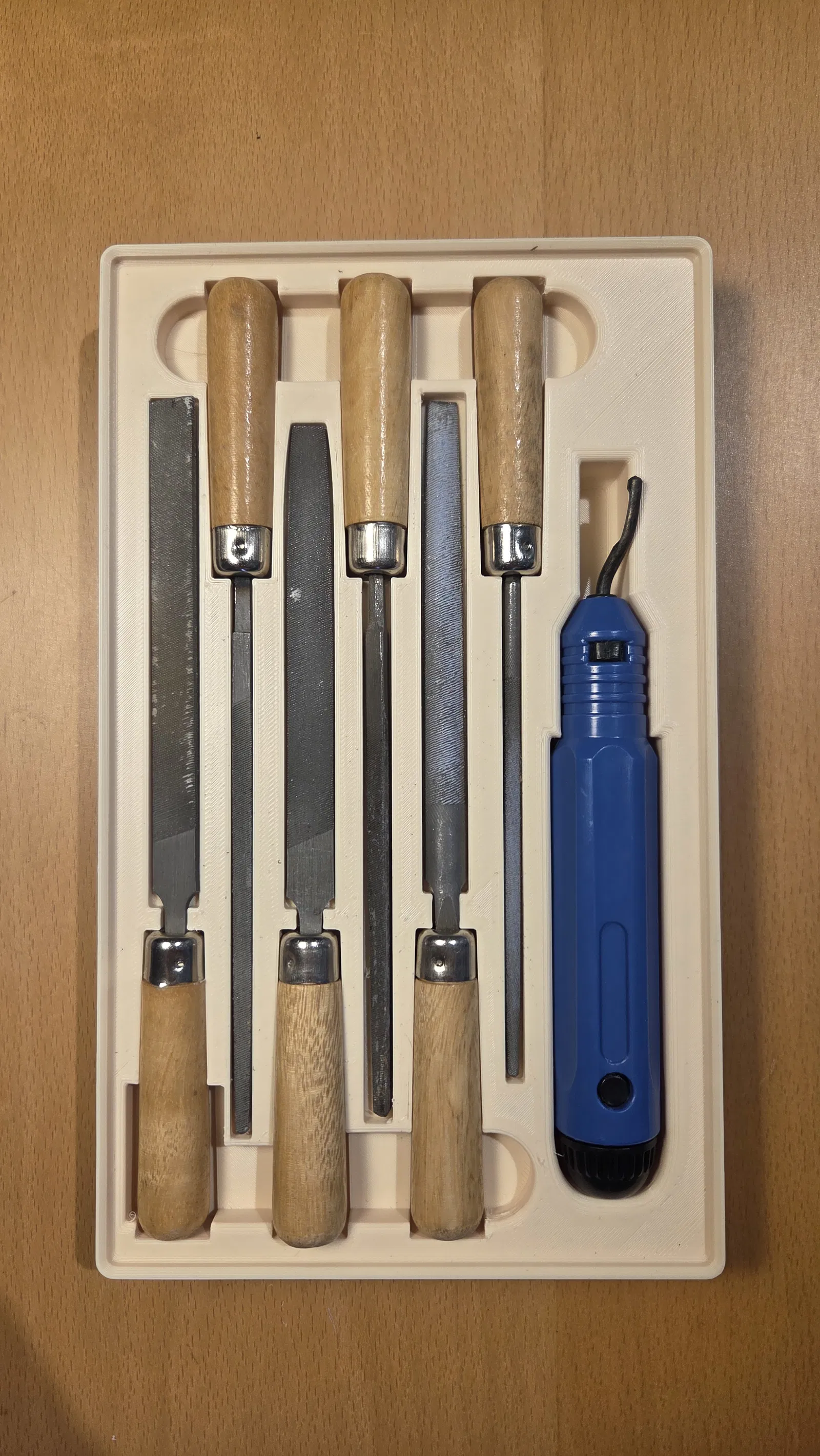 Khay/holder theo chuẩn Gridfinity để sắp xếp 5 cây needle files cán gỗ (180mm) và 1 dụng cụ tẩy ba via NB1100. Có lỗ chừa sẵn gắn nam châm 6x3mm, khe móc tay dễ lấy, in PLA/PETG/ABS.