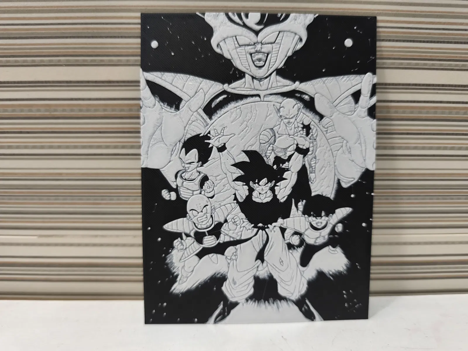 Mẫu Hueforge Goku y Freezer (Dragon Ball) dạng decor. In 100% infill, layer height 0.08mm, base layer 0.1mm. Bắt đầu Black, tới layer #7 (0.58mm) đổi sang Jade White cho phần còn lại.