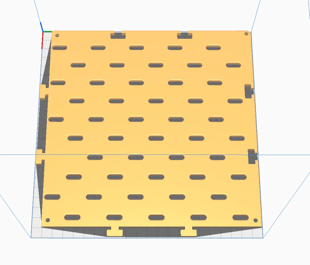 Đã thêm các khớp nối dạng puzzle ở cả 4 cạnh để kẹp nhiều tấm Skådis lại với nhau. Ngàm đực (bên phải/bên dưới) và rãnh cái (bên trái/bên trên) cho phép lắp kiểu trượt vào, tạo bố cục dạng lưới có thể mở rộng.