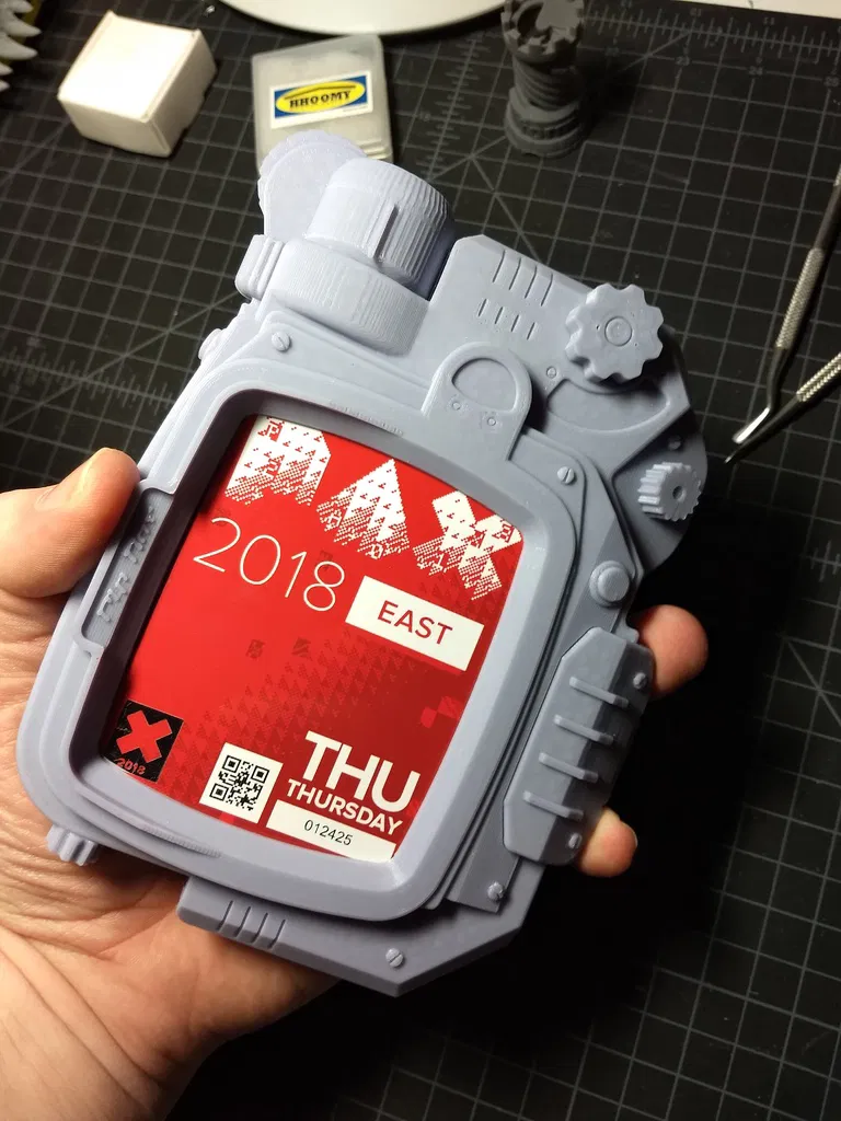 Thiết kế kẹp thẻ lấy cảm hứng từ Pip-Boy 3000 Mk IV, vô tình làm ra nguyên “Pip-Boy” phiên bản phẳng. Dùng nam châm 5x1mm để gắn nắp trên với phần đáy; hiện chưa có chỗ cho lanyard.