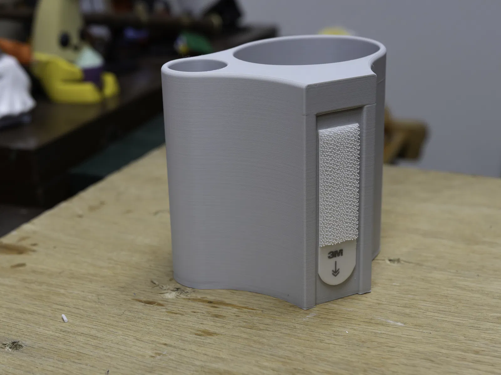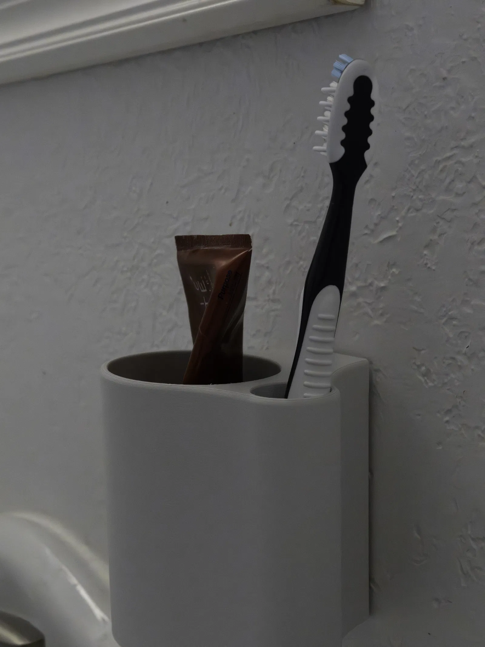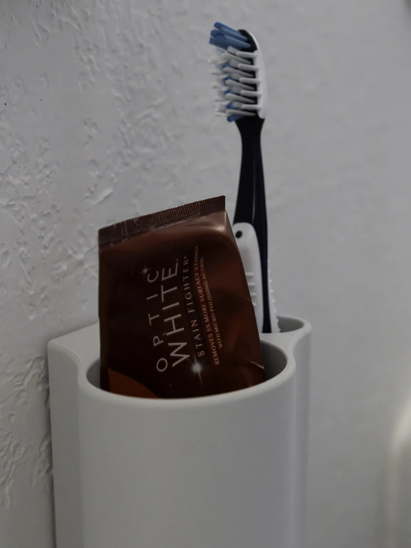 Giá treo tường cho bàn chải và kem đánh răng, dán bằng command strip cỡ medium, chịu khoảng 5lbs (~2,2kg). Mẫu đơn giản, không cần supports, in layer 0.2mm; nên tải file về và tự slice theo máy.