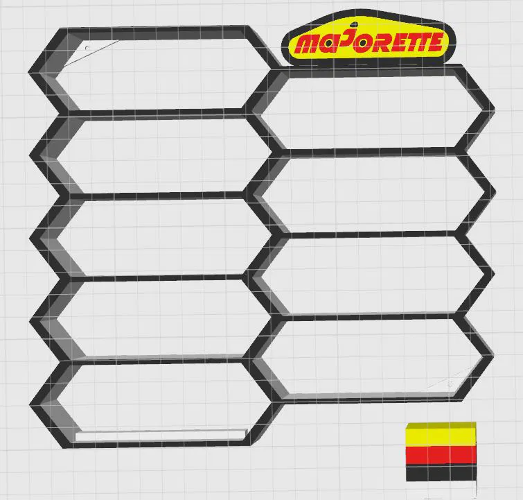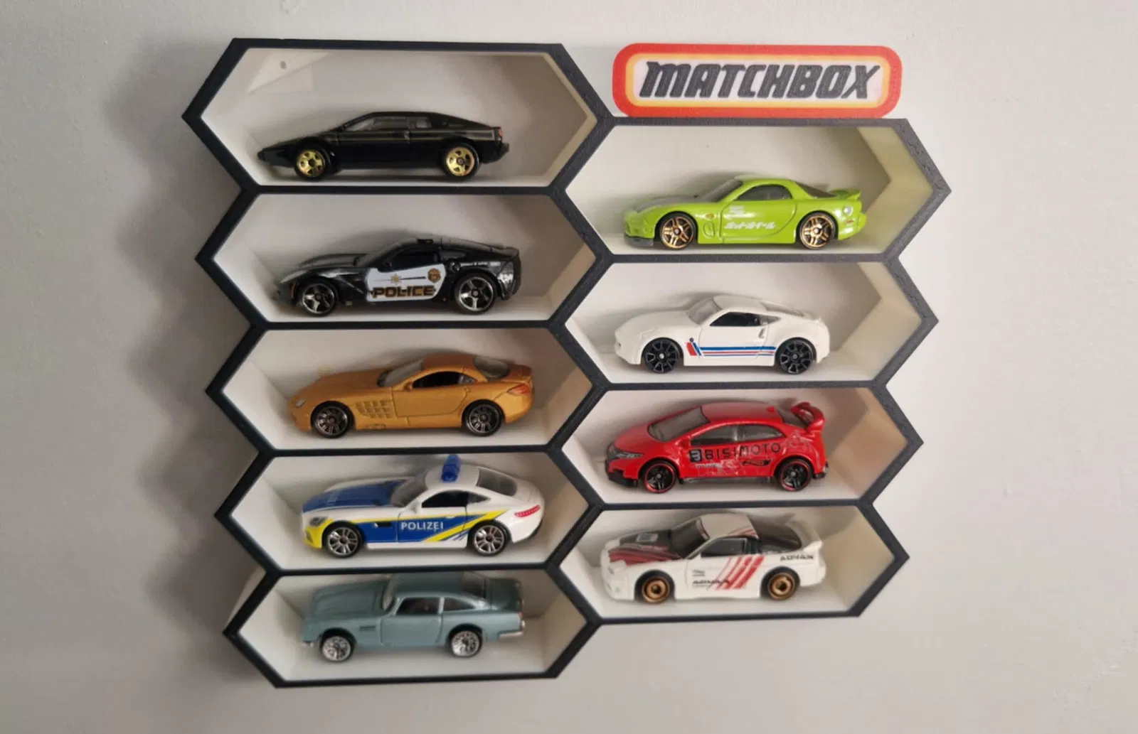 Kệ trưng bày xe mô hình 1/64 treo tường dạng lục giác in 3D, bố cục tổ ong chứa 9 xe. Phía trên có logo thương hiệu nổi bật, giúp trưng bày gọn gàng, hiện đại và tiết kiệm diện tích cho bộ sưu tập die-cast.