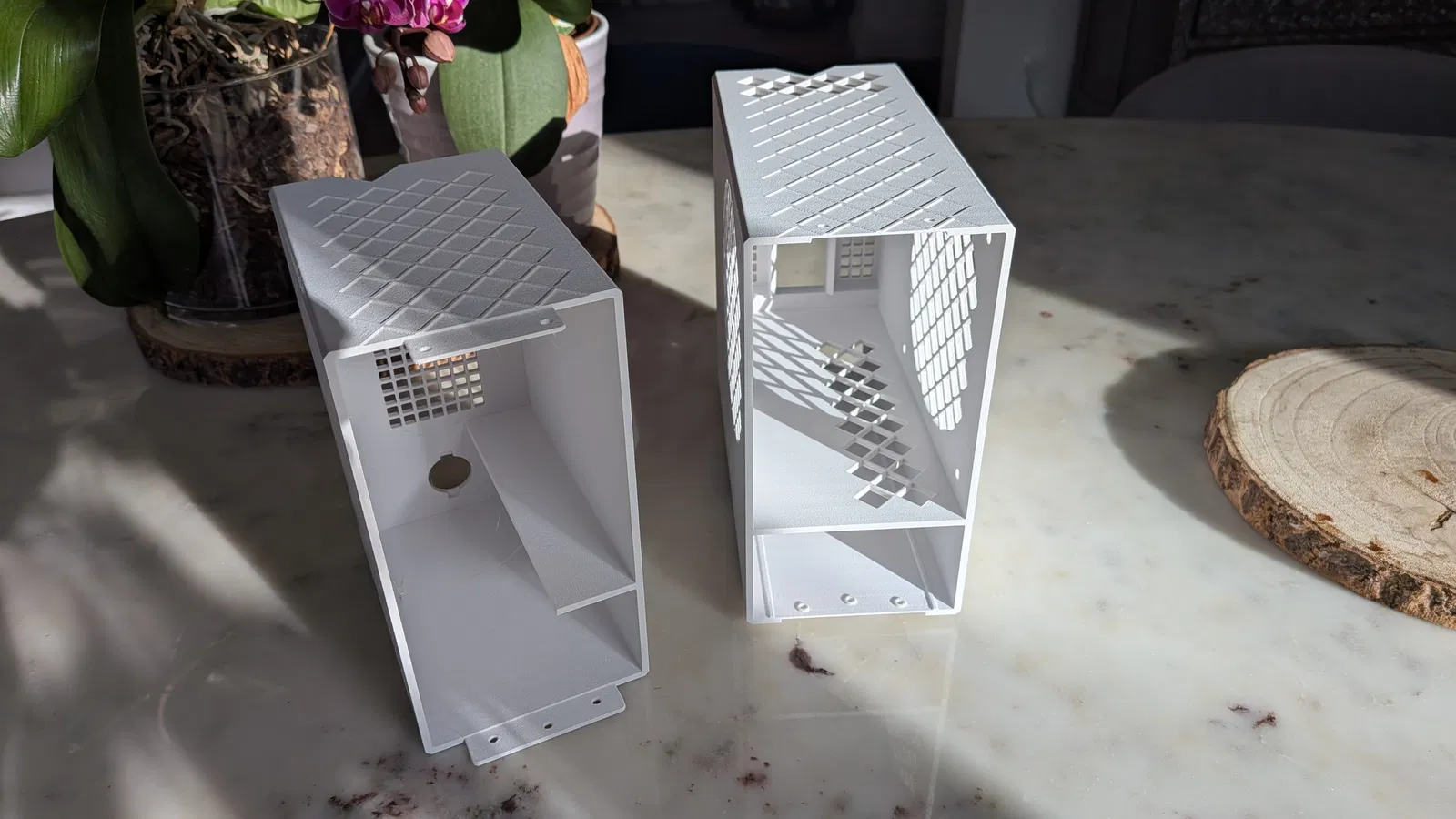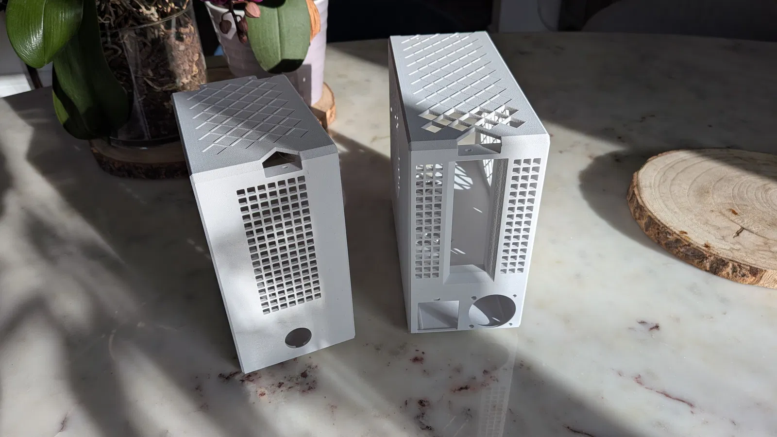 Bộ case này được thiết kế để thử nghiệm board BC-250 với nhiều cấu hình airflow khác nhau. Mình muốn một thiết kế đơn giản, dễ in — 2 mảnh, và không có overhang cần support.