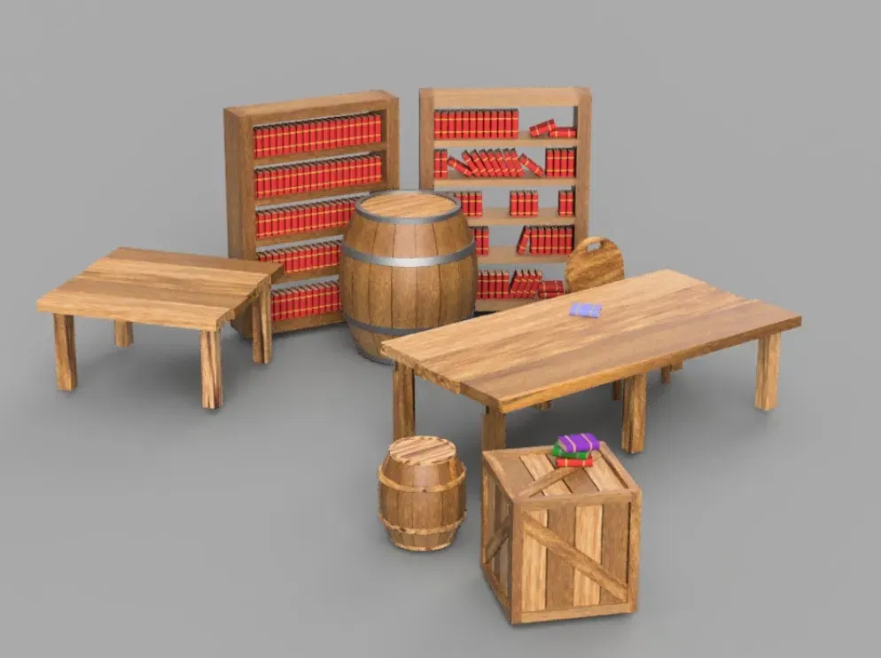 Có nhiều tệp khác nhau bao gồm: hộp vật liệu, thùng, kệ sách, bàn và ghế