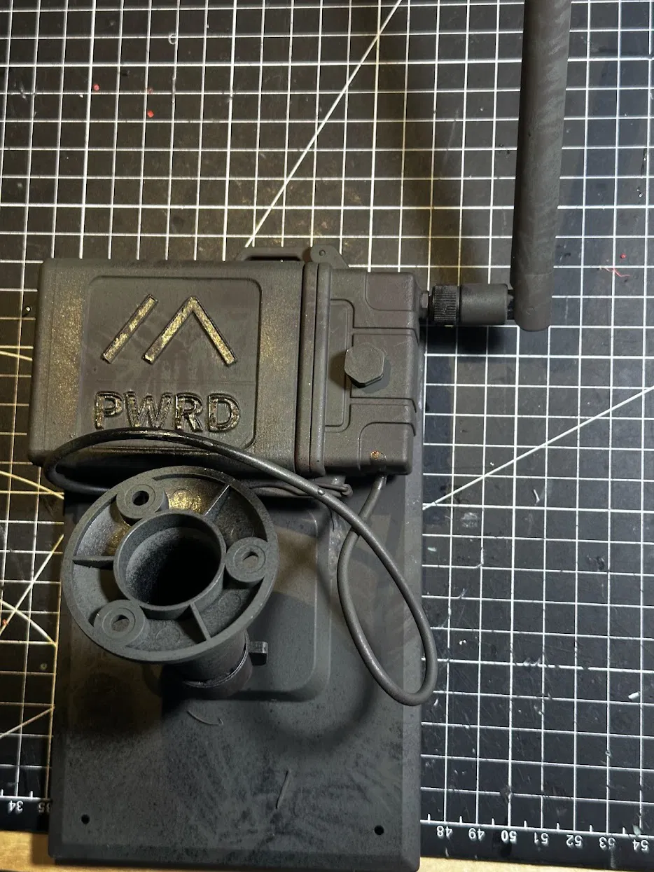Node này dùng hộp đựng thuốc lá/bật lửa chống nước làm vỏ, kèm theo sled (khay) node in 3D và holster (ốp) cho hộp. Dán cả cụm hoàn chỉnh ra sau bất kỳ tấm pin năng lượng mặt trời kiểu “security camera” nào là bạn có một node siêu ổn định, kín đáo, đem đi gắn gần như ở đâu cũng được.