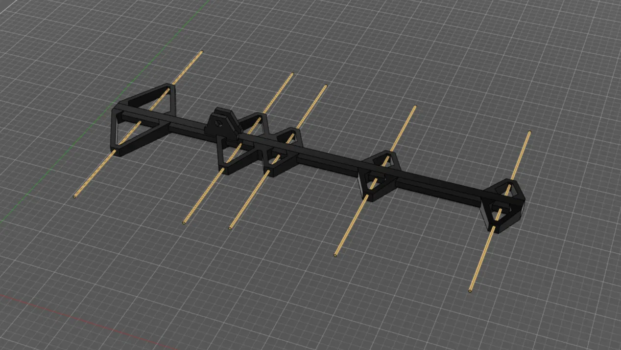 Khung anten Uda Yagi 5 phần tử cho tần số 868 MHz, gain khoảng 10 dBi. Có đầy đủ kích thước reflector/vibrator và các director (D1–D3), dùng ống đồng 1,6 mm; hỗ trợ gắn action camera mount hoặc bắt ốc 5 mm.