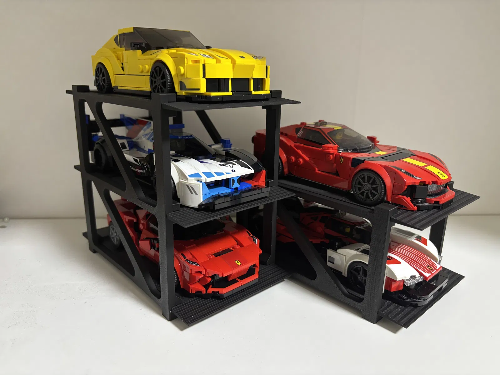 Kệ để xe Lego Speed Champions đơn giản cho 2 hoặc 3 chiếc. Có thể trong tương lai sẽ có phiên bản kệ cho 4 xe. Dễ lắp ráp, không cần keo hay ốc vít. Chỉ cần trượt vào là xong, kệ tự giữ chắc nhờ độ kẹp của chính nó. Thiết kế cho các xe bản 8 stud. Có rãnh nhỏ cho lốp để tăng độ ổn định cho mô hình.