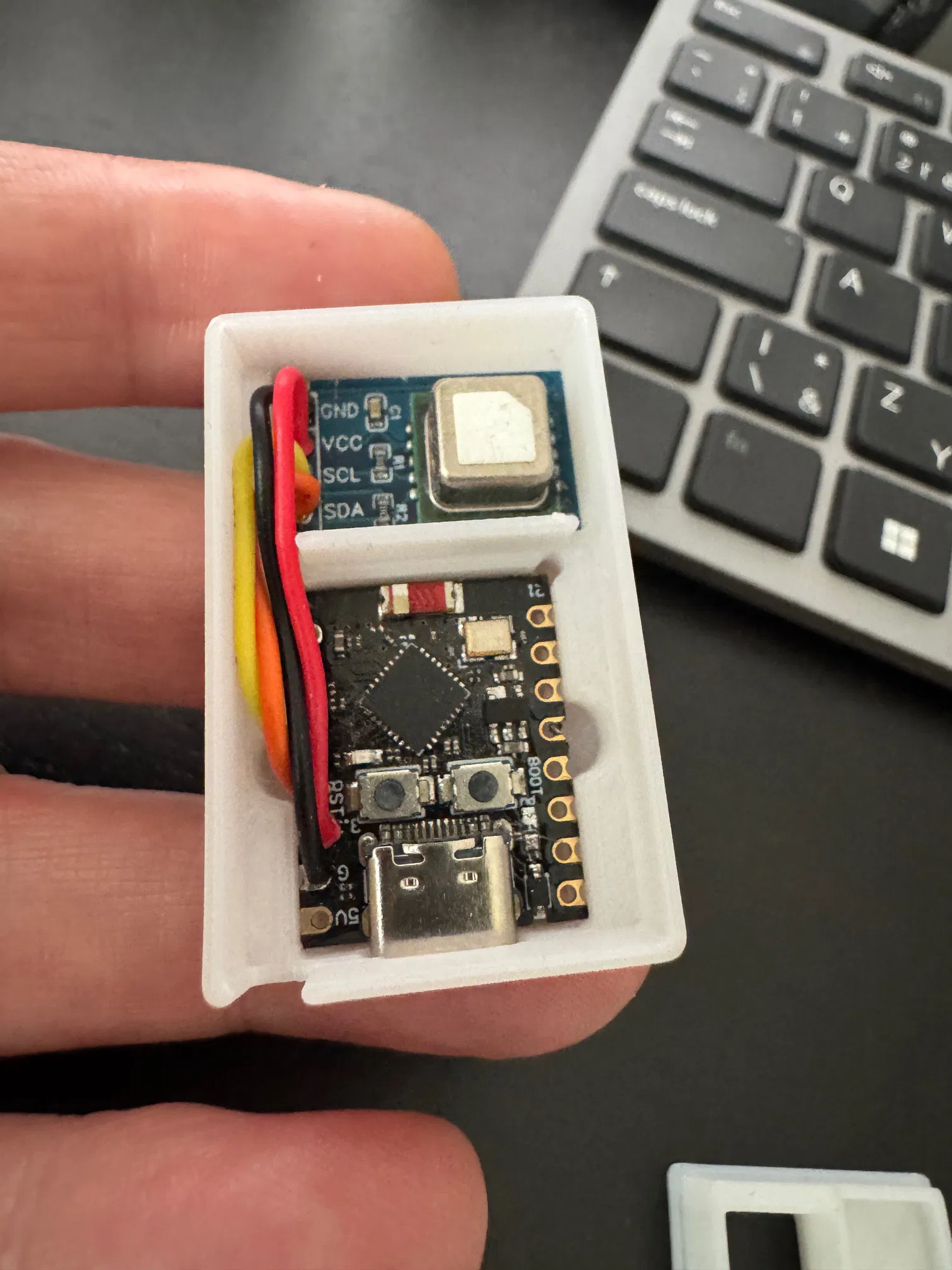 Mẫu hộp dùng để lắp ESP32-C3 (vi điều khiển Wi‑Fi/BLE) cùng cảm biến CO₂ Sensirion SCD41, giúp gọn gàng và bảo vệ linh kiện khi triển khai dự án đo CO₂.