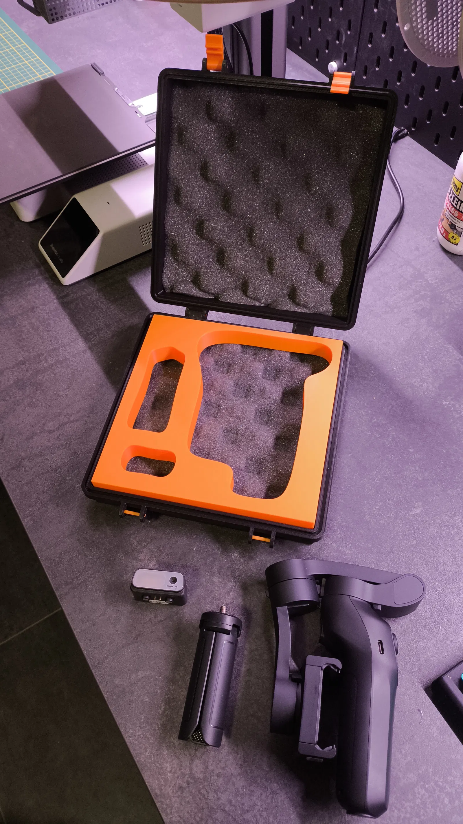 Mình đang tìm một cái hộp phù hợp cho chiếc gimbal của mình. Tiếc là tìm hoài không ra nên mình thiết kế nhanh cái hộp này. Mình còn lót thêm mút xốp (foam) bên trong, nên mọi thứ đặt vào vừa khít và gọn gàng.