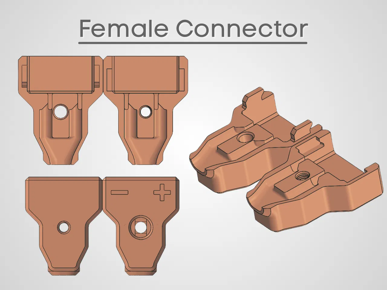 Đầu nối nhanh kiểu friction fit cho 2 dây, dùng với spade terminals tiêu chuẩn để thay đổi dây/nguồn nhanh. Cần 2 vít M3x8 và 2 cặp Male/Female Spade Connector; không cần supports, in mặt phẳng úp xuống.