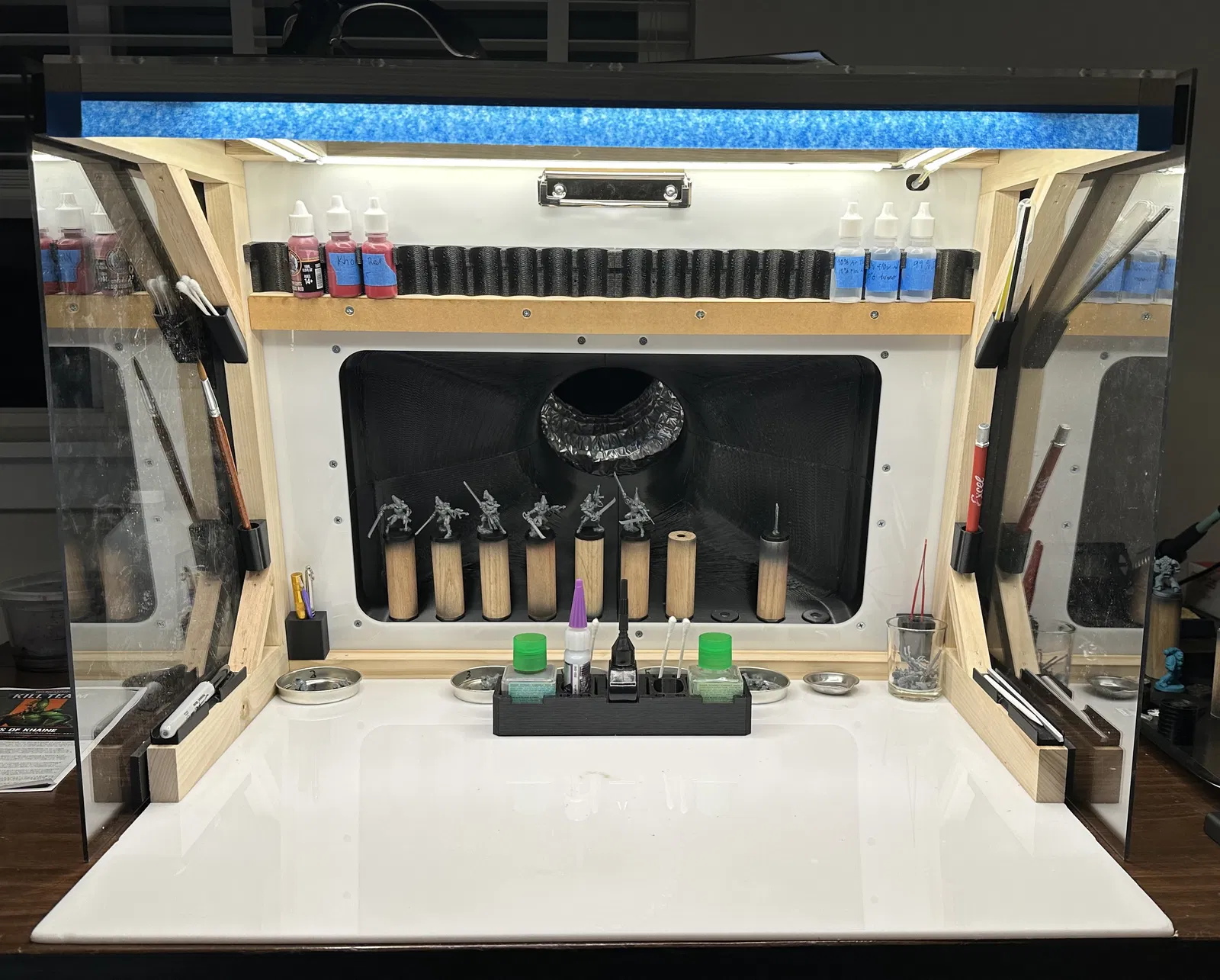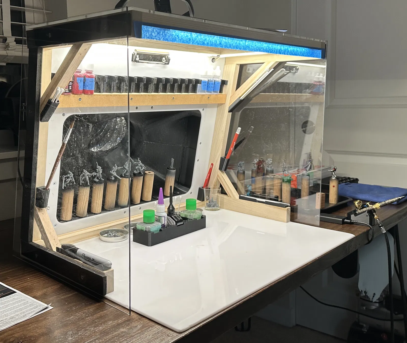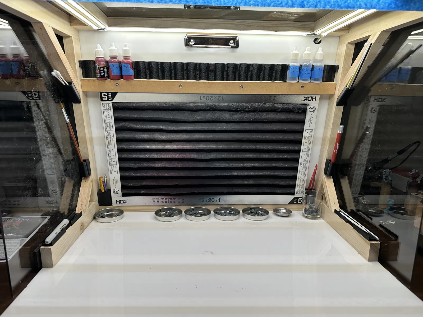 Thật ra đây là cái airbrush booth thứ hai mình làm. Rút kinh nghiệm từ lần đầu, mình thấy vách hông tháo nhanh là một yêu cầu bắt buộc. Mình nhận ra vách hông kiểu kín làm cảm giác như đang thao tác trong “phòng trắng”, che tầm nhìn/lối với ra phần còn lại của bàn, trong khi chỉ hữu ích lúc airbrush.