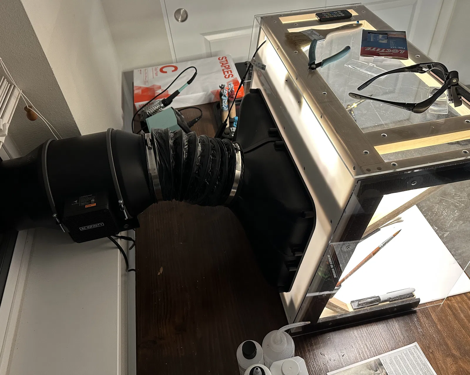 Mình không hài lòng với mấy cái airbrush booth đang bán trên thị trường, nên quyết định tự làm một cái. Thứ mình muốn là một buồng làm việc thông gió đa dụng, để vừa có thể lắp mô hình hoặc hàn mà không lo khói/khí, đồng thời có thể chuyển nhanh sang việc airbrush sơn acrylic (thật ra cũng không thường xuyên) để sơn lót (priming) và sơn nền (base coating). Dù mình nghĩ booth này có thể đủ sức hút cho sơn gốc lacquer, nhưng thành thật là trong nhà thì có đeo PPE cỡ nào mình cũng không thấy yên tâm để làm vậy.