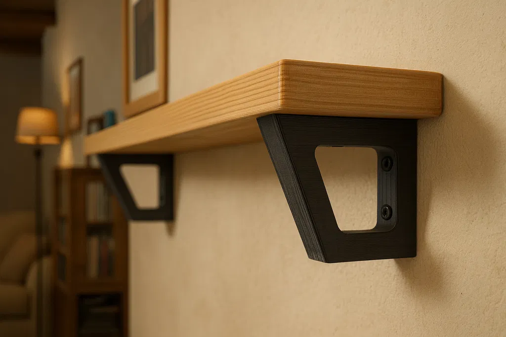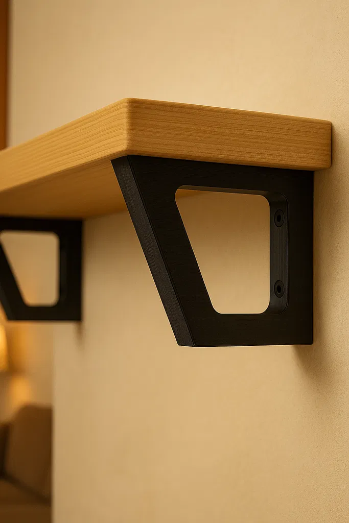 Giá đỡ tường in 3D này được thiết kế để đỡ kệ gỗ theo cách vừa đẹp mắt vừa thực dụng. Với dáng góc cạnh gọn gàng và phần khoét rỗng ở giữa, mẫu kết hợp độ cứng và sự tối giản, rất hợp với không gian nội thất hiện đại.