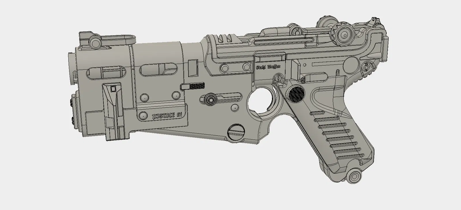 Bản re-upload mẫu Luger 1961 từ Wolfenstein: The New Colossus/The New Order. Prop không hoạt động, tách nhiều phần để in rời. Tác giả từng bán trước đây, nay phát hành miễn phí; không có color profiles.