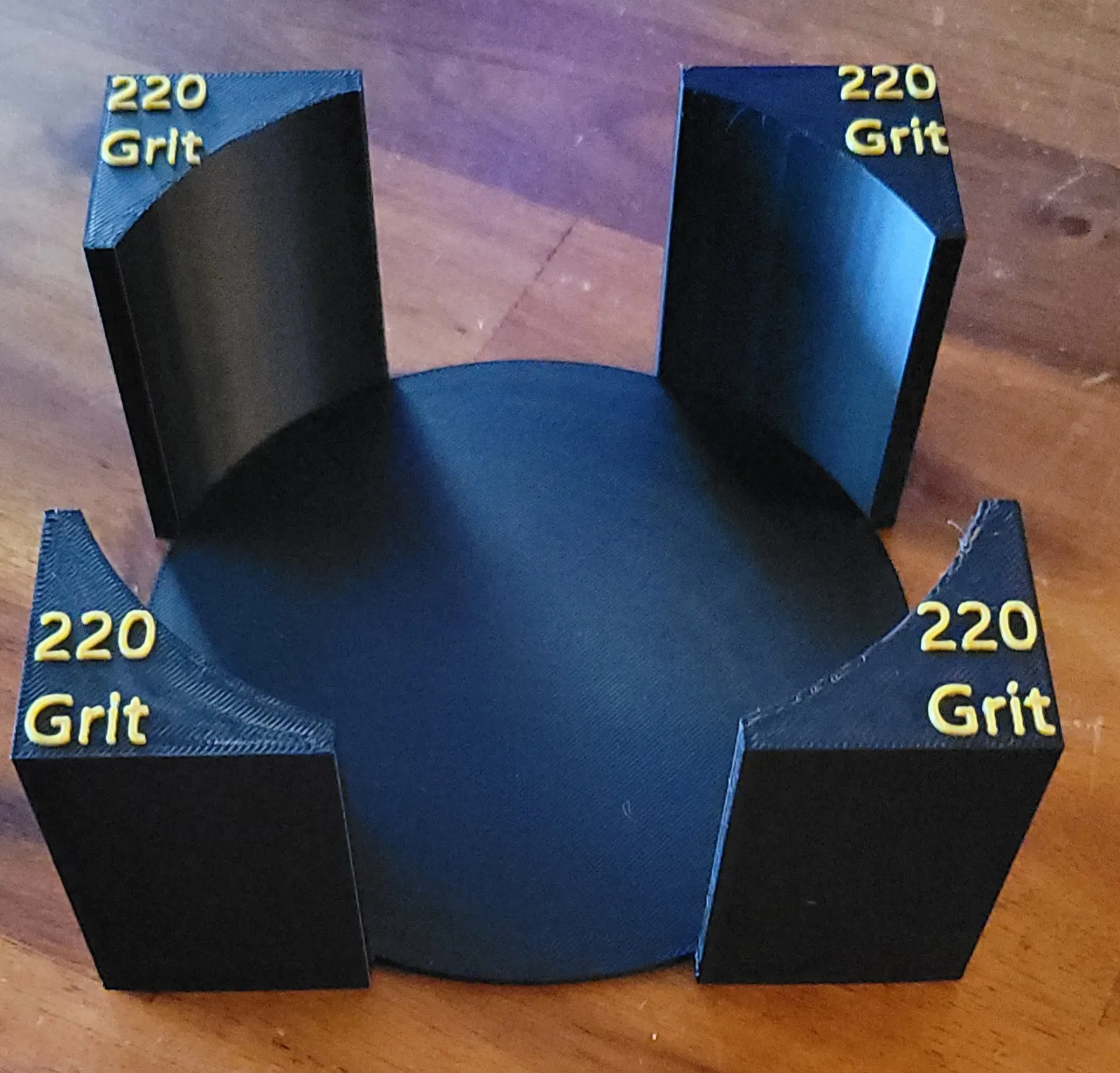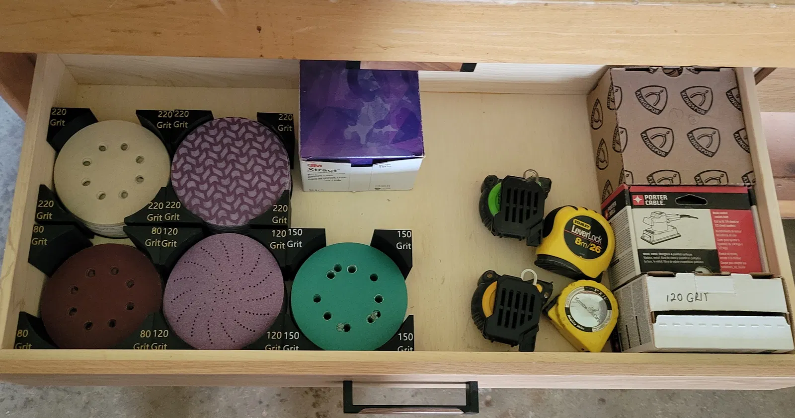 Khay này dùng để đựng giấy nhám (random orbit sanding disks) cỡ 5". Nó được thiết kế để sắp xếp các đĩa giấy nhám trong ngăn kéo, chiếm ít diện tích nhất có thể. Khay có kích thước khoảng ~5.2 inch vuông, chừa đủ khoảng để dễ kéo các đĩa ra, và còn dư một chút ở các góc để bạn thêm chữ ghi độ nhám (grit).