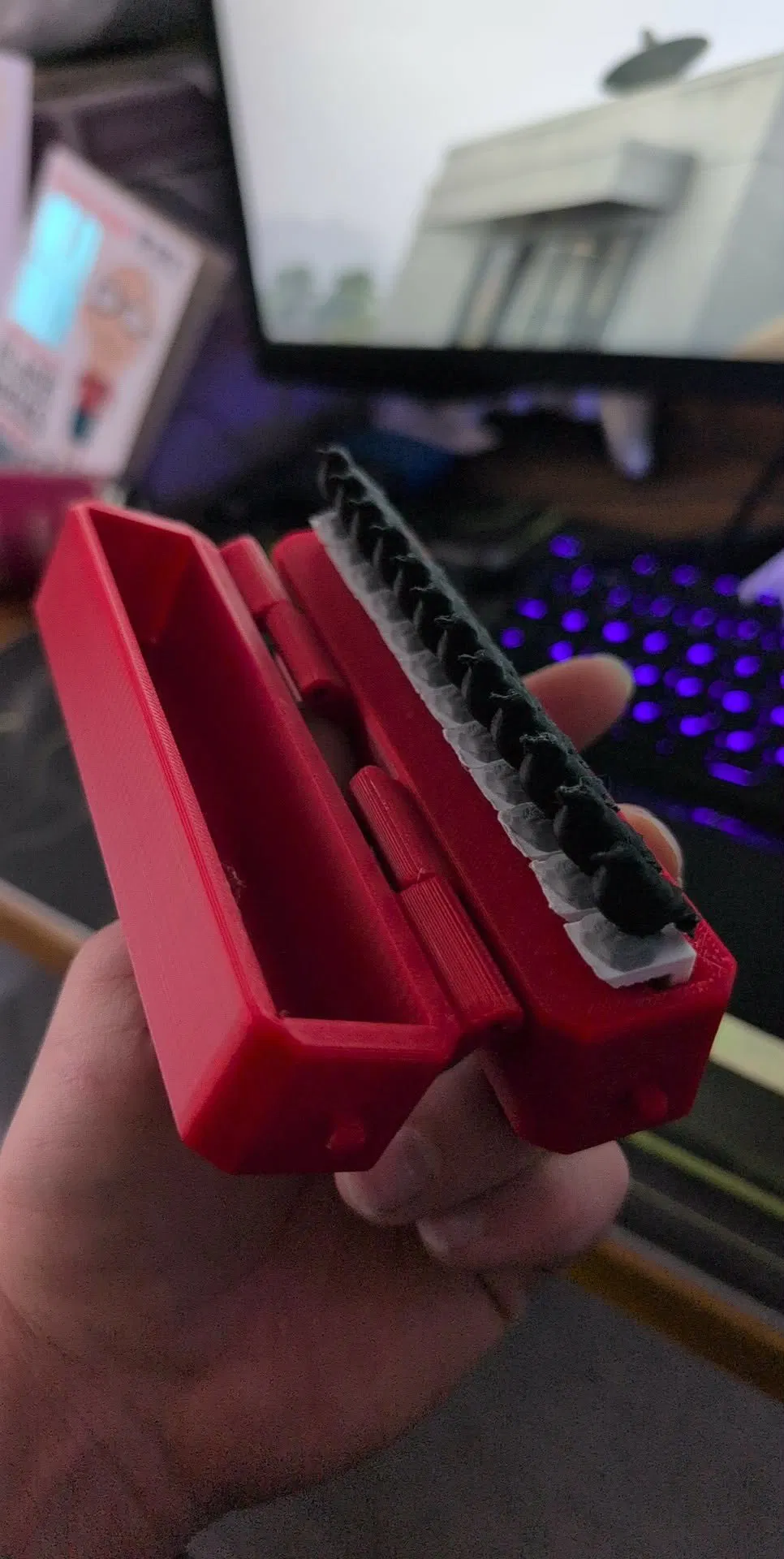 Có thể gắn 2x dây thun lên các móc và vòng ra phía sau bản lề để giữ hộp đóng hoặc mở