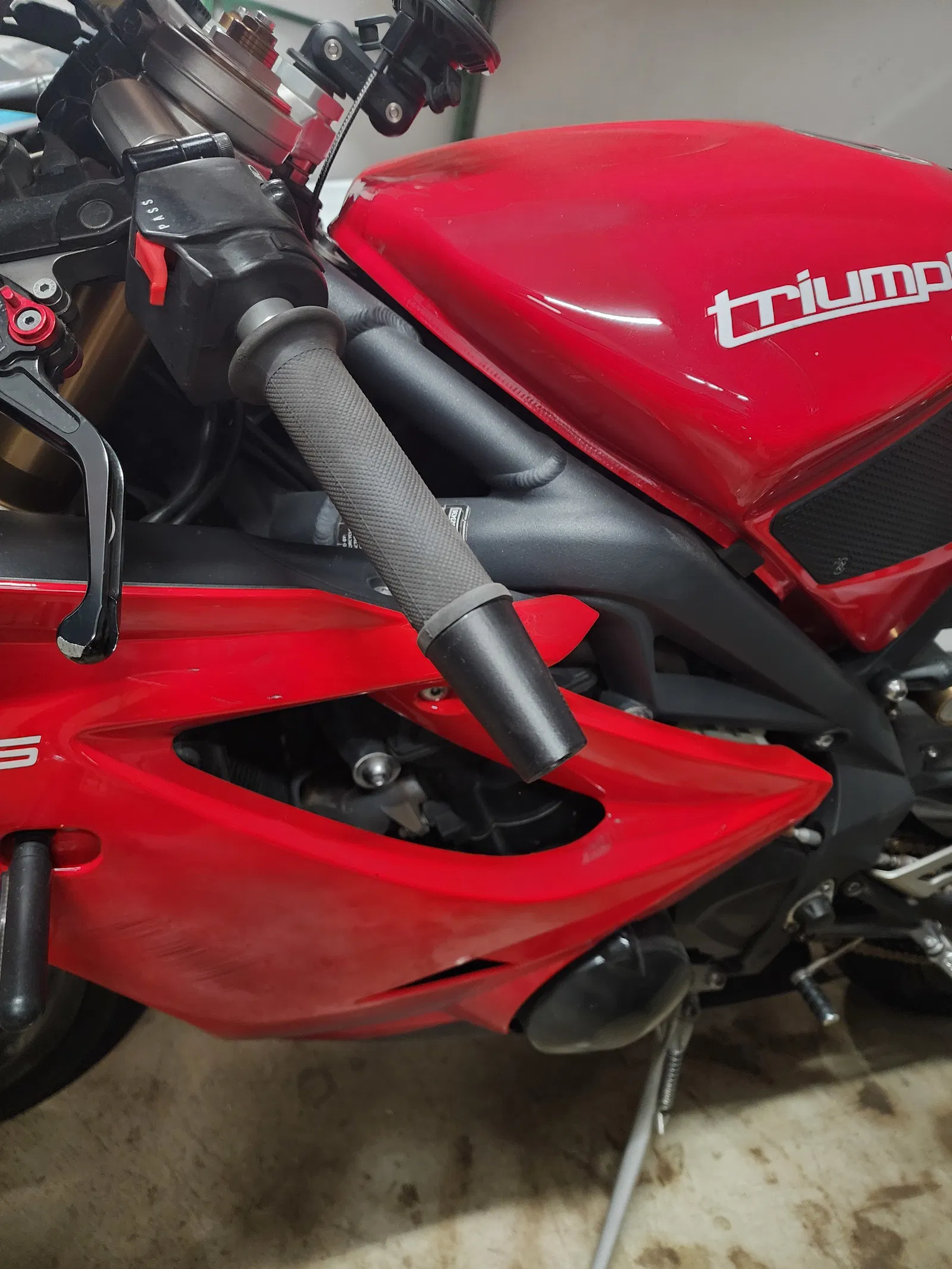 Bar end cho Triumph Daytona 675 đời 2 khi clip-on bị thiếu/rỗng. Dùng bolt 5/16 dài 50mm, giữ bằng ma sát. Khuyến nghị in 100% infill để hạn chế tách lớp; I.D. ống khoảng 16.5mm.