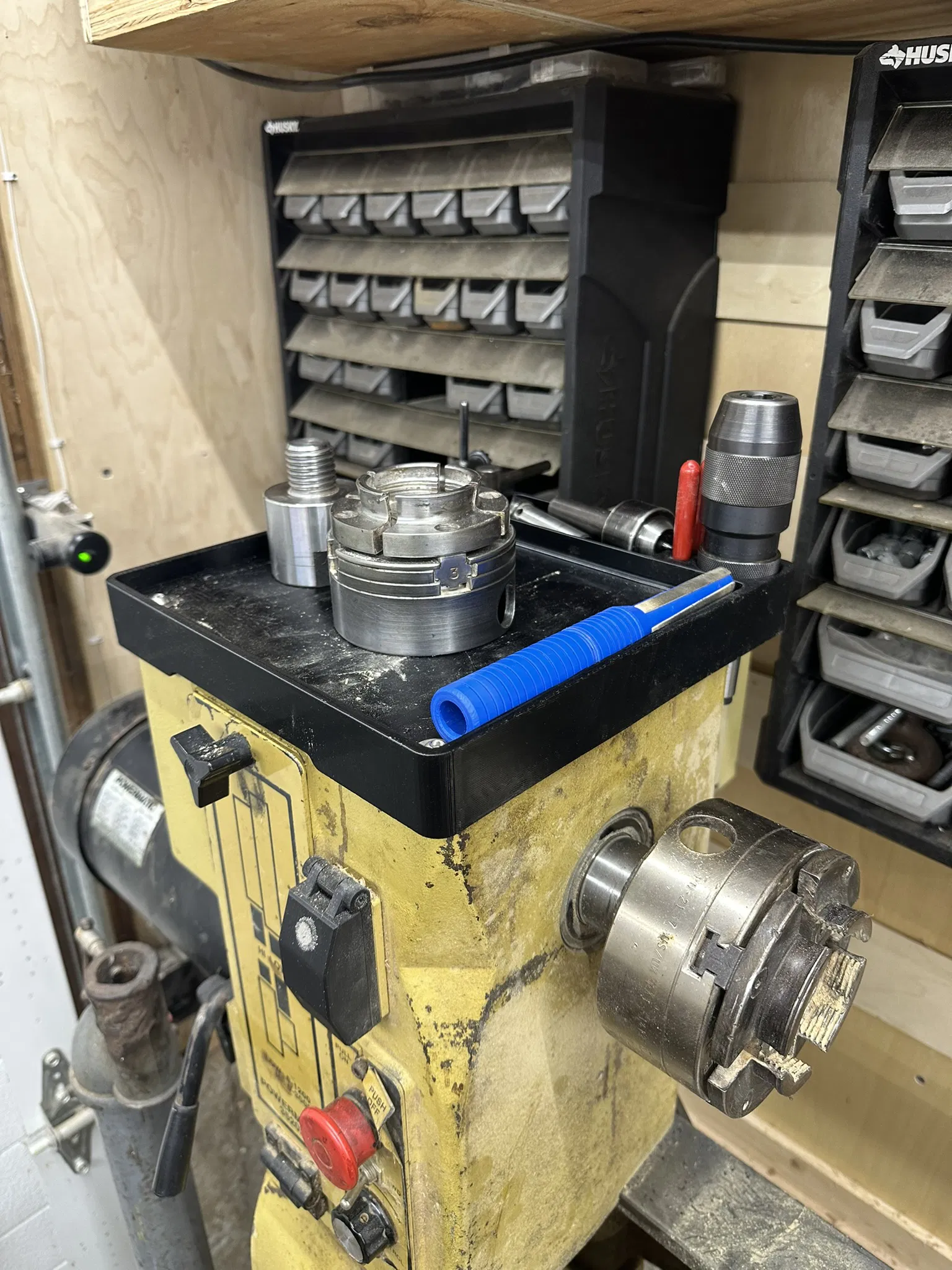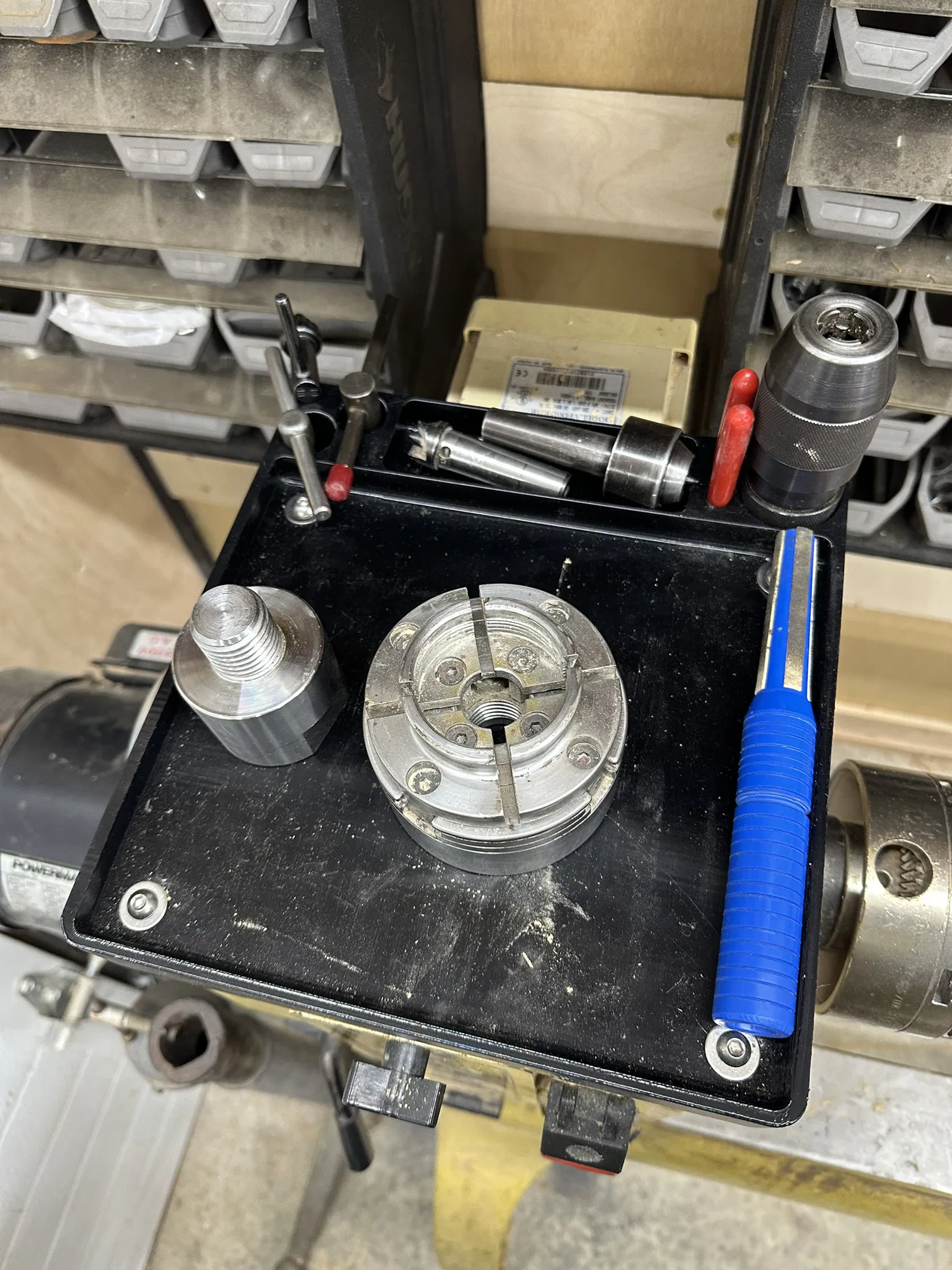 Khay đơn giản bắt ốc trực tiếp lên headstock của máy tiện Powermatic 3520a, giúp để các dụng cụ hay dùng như drill, chuck và đồ nghề nhỏ gọn, dễ lấy khi thao tác.