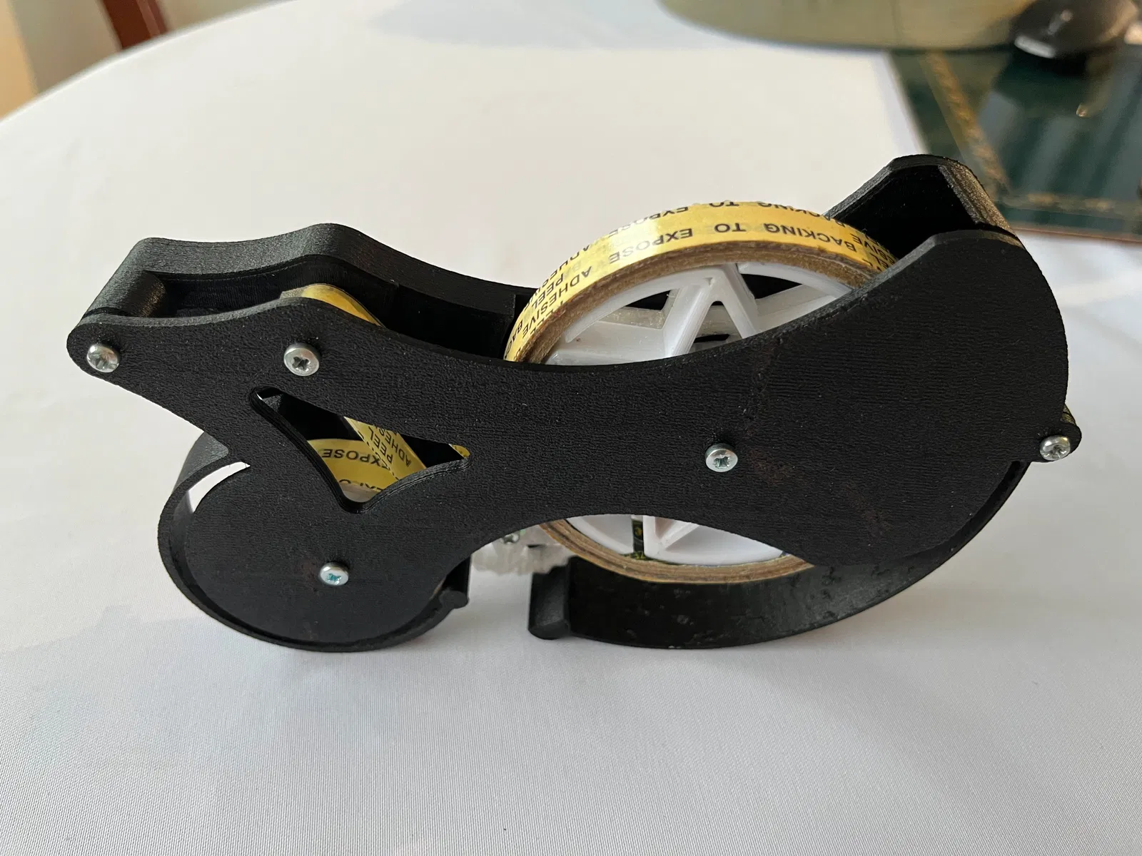 Đây là một cái dispenser chức năng, in 3D được 100%, thiết kế cho loại băng keo 2 mặt mỏng. Dùng loại băng keo này bằng tay khá bực mình vì lớp giấy lót dính; thiết kế này tự động bóc lớp lót và cuộn thu lại lên một cuộn (take-up reel) trong lúc bạn kéo băng keo.