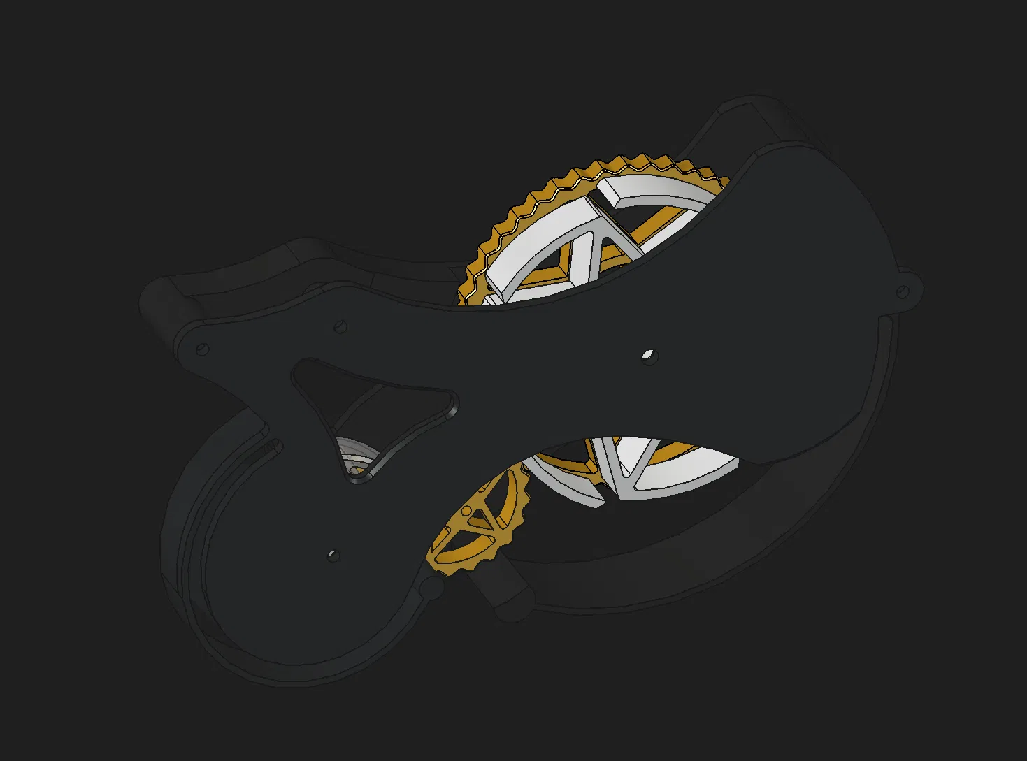 Trọng tâm của thiết kế là xử lý việc đường kính cuộn cấp (supply reel) và cuộn thu (take-up reel) thay đổi liên tục. Cơ cấu có một hệ slip-clutch chuyên dụng để giữ giấy lót luôn căng mà không bị đứt hoặc làm kẹt bánh răng. Thiết kế dùng các bánh răng có răng được tính để “trượt” (slip), thay vì bánh răng involute tiêu chuẩn. Cuộn thu có lò xo xoắn (internal torsional spring) bên trong để đảm bảo giấy lót luôn có lực căng ổn định, tránh bị tạo vòng hoặc rối bên trong vỏ. Bánh răng giữa (idler gear) được lò xo đẩy ép vào các bánh răng còn lại, và lò xo này cũng quyết định lúc nào nó sẽ trượt.