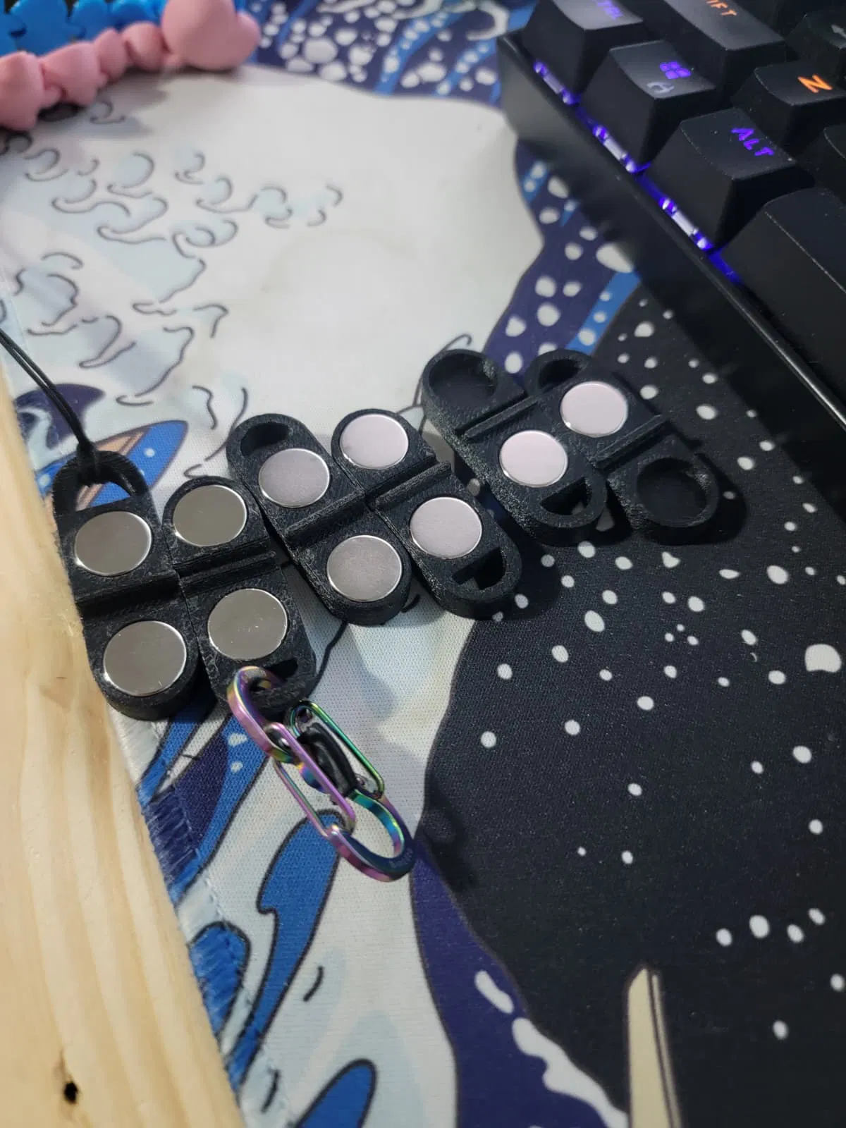 Mình nghịch nam châm hơi nhiều nên bắt đầu mê mấy cái keychain magnetic quick disconnect. Trước đó mình làm một kiểu khác dùng cũng ổn, nhưng mình nghĩ sẽ hay hơn nếu làm một hệ mà tất cả các miếng đều giống hệt nhau, để có thể hoán đổi và gắn với bất kỳ miếng nào khác.