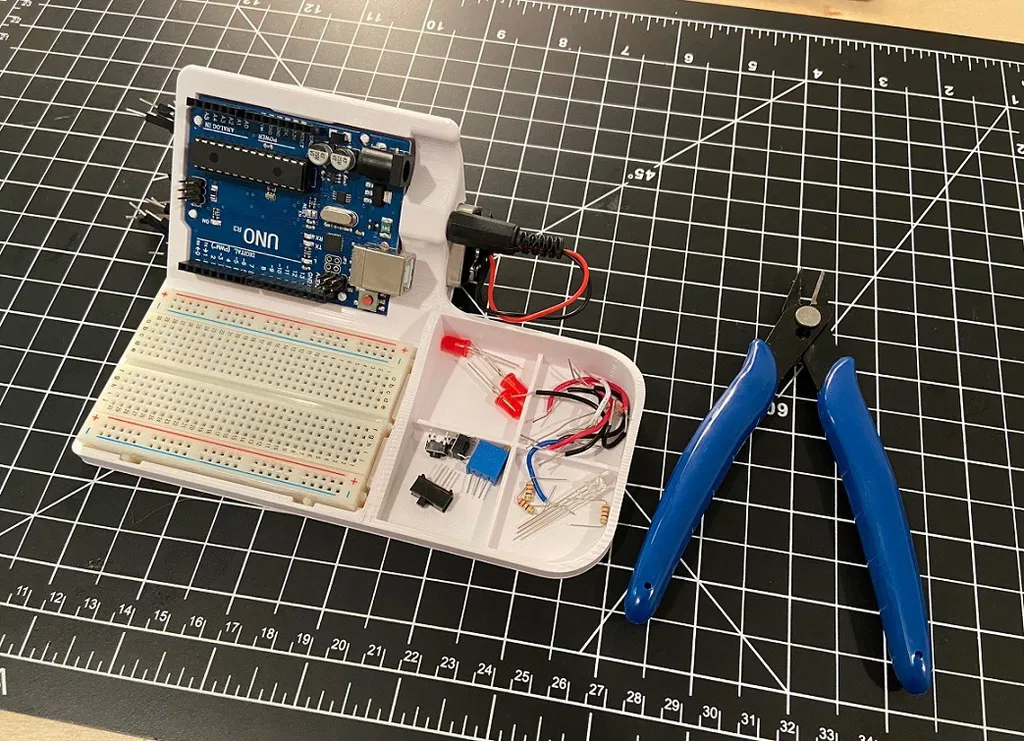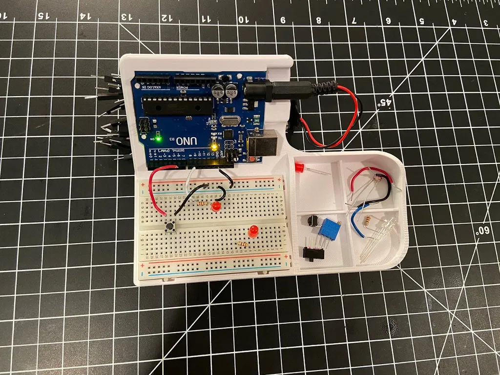 Đây là thiết kế khung giữ Arduino Uno với breadboard, được thiết kế để đặt Uno ở góc 45 độ, có ngăn chứa pin 9v, khay đựng linh kiện và chỗ để dây jumper. Mô hình nhỏ gọn, dễ in và trông cũng được. Có các tùy chọn remix với thêm khay đựng.