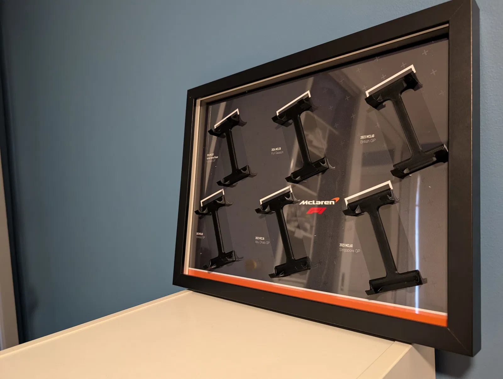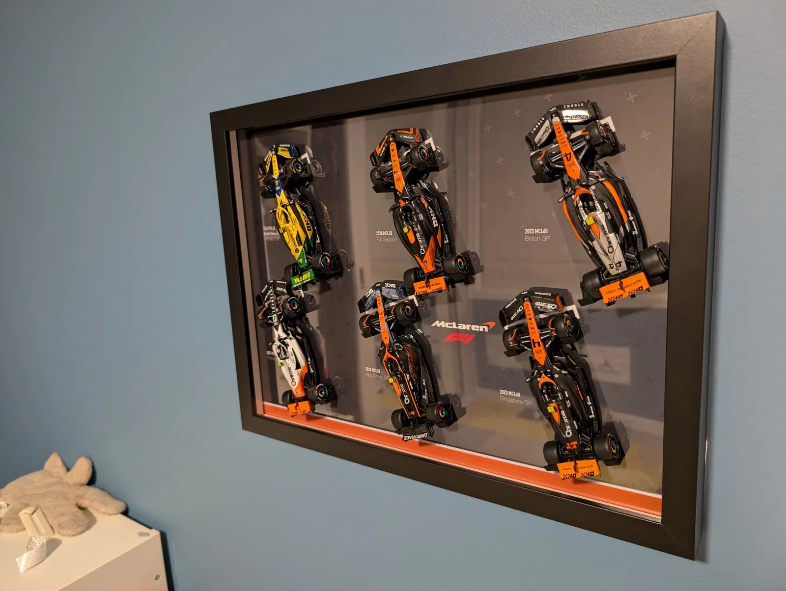 Mình làm cái này cho bộ sưu tập McLaren của con trai đang ngày càng nhiều, sau khi bé “xuống tiền” tiền mừng sinh nhật cho bộ quà tặng MCL36 & MCL60. Thay vì mua hộp trưng bày mắc tiền, nhà mình biến cái khung IKEA RÖDALM giá khoảng $10 (30x40 cm) thành một tủ trưng bày đúng nghĩa với nền chủ đề McLaren tự làm và các ngàm treo nghiêng này. Treo lên tường nhìn rất đã, mà chi phí chỉ bằng một phần nhỏ so với đồ thương mại.