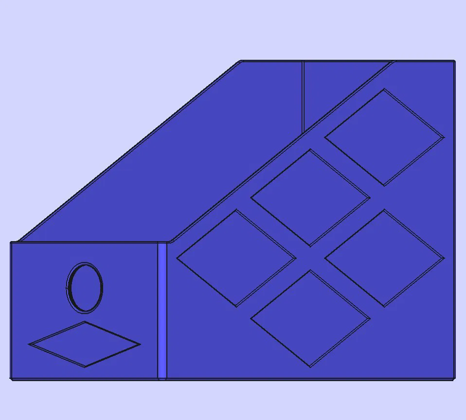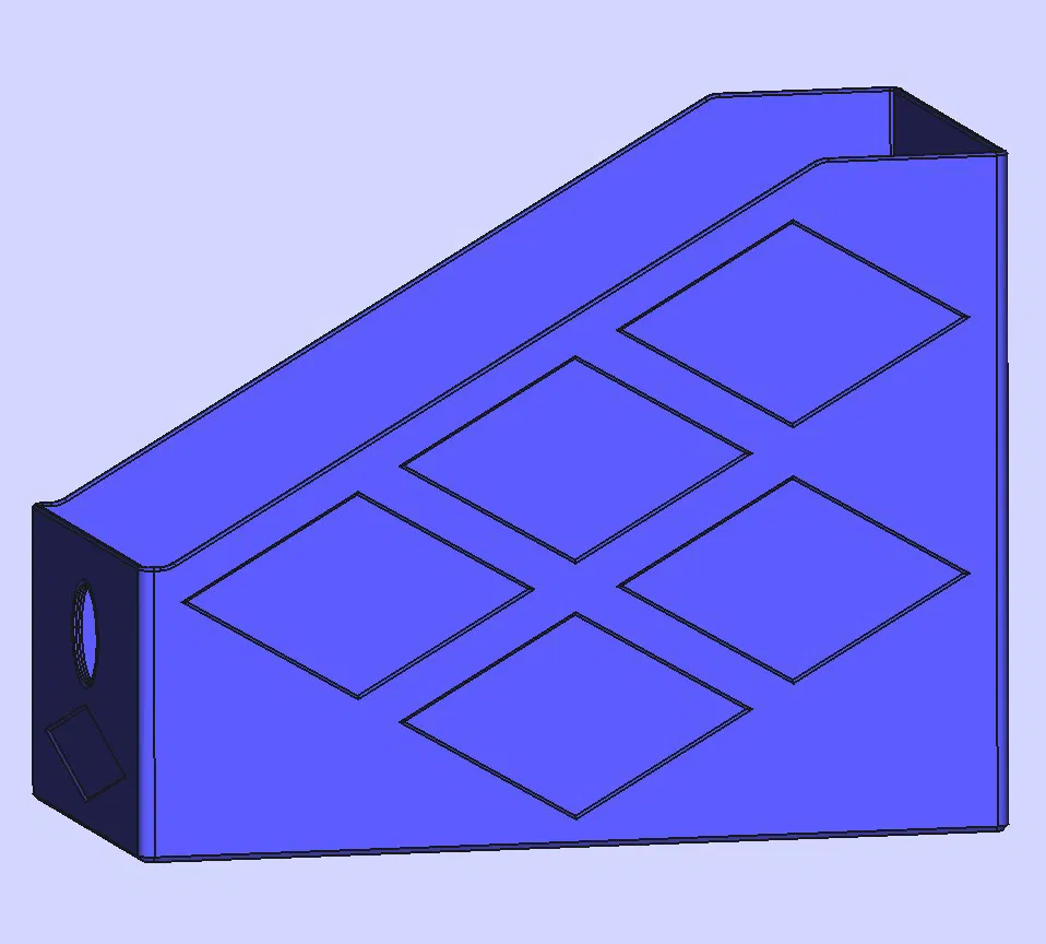 Khay/kệ đựng tạp chí, sách hoặc brochure khổ A4 nằm ngang (landscape). Kích thước: sâu 310 mm, cao 220 mm, bề rộng tùy chọn 60–160 mm. Hai đầu có lỗ để kéo ra dễ, cạnh bo tròn an toàn.