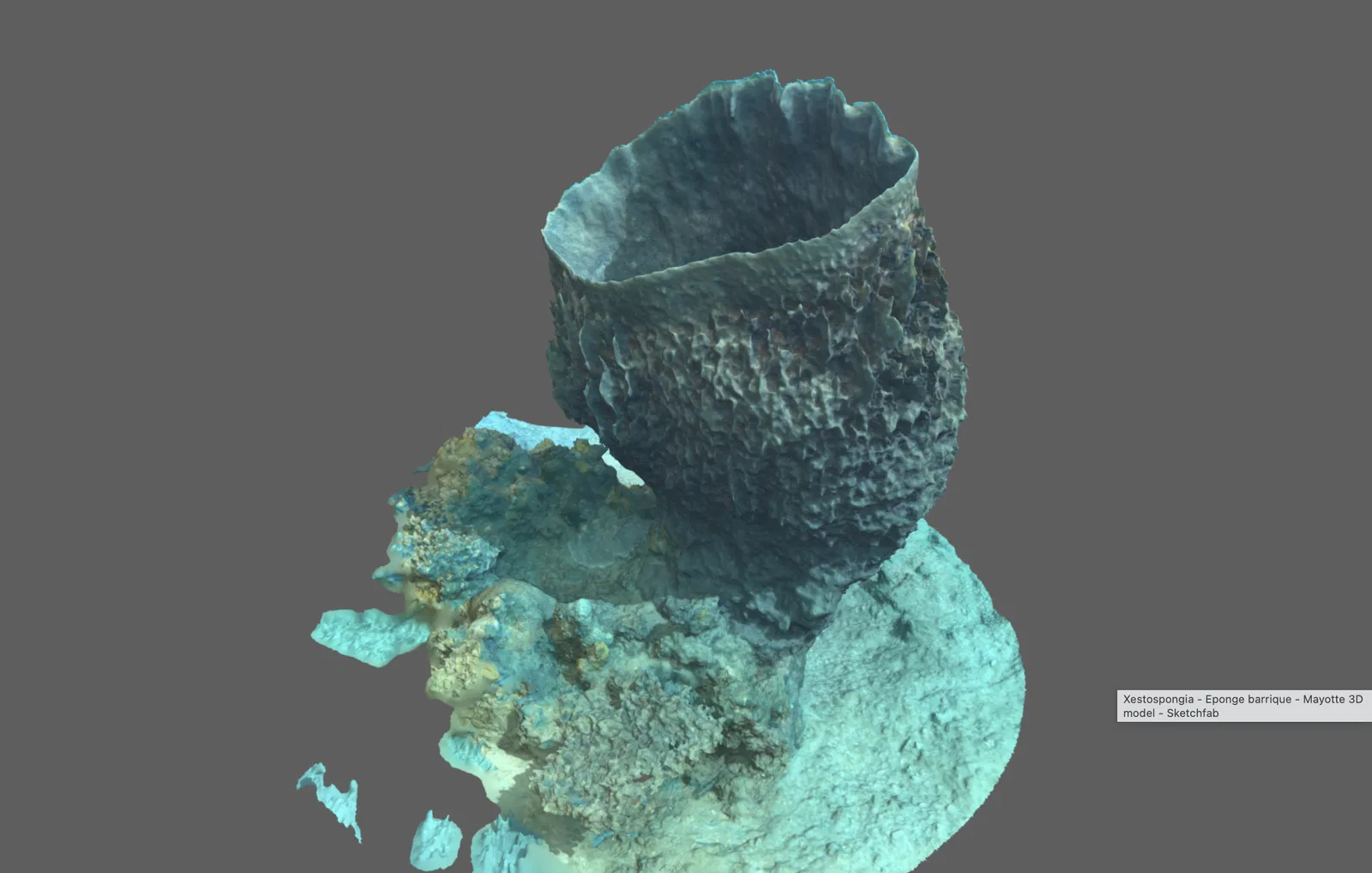 Mô hình UW photogrammetry của Xestospongia (giant barrel sponge) từ Mayotte, phù hợp để xem chi tiết hình thái và làm tư liệu 3D cho học tập, nghiên cứu hoặc dựng cảnh dưới nước.