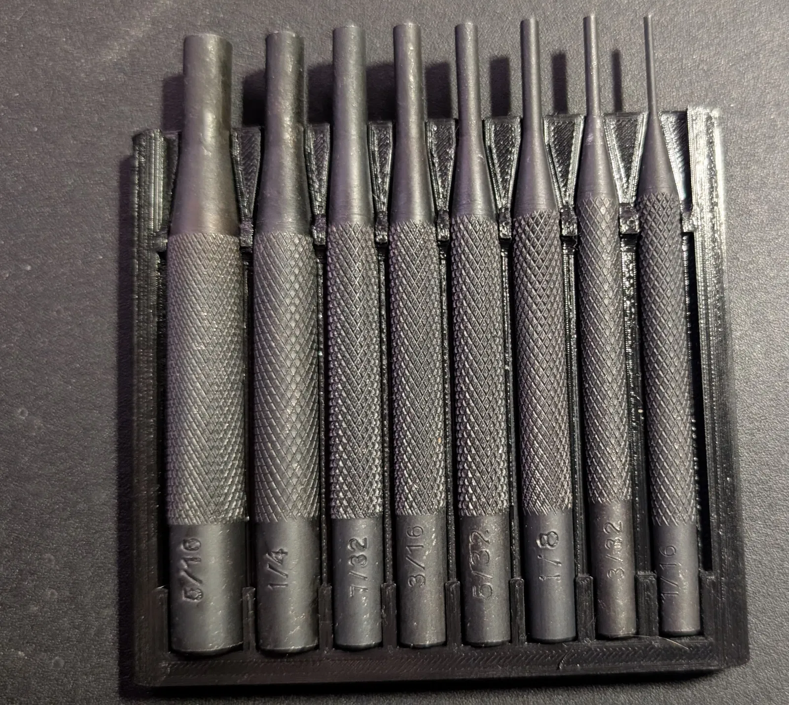 Mình thấy mấy cây pin punch này cứ lăn lung tung rồi bị lộn thứ tự hoài, nên mình thiết kế một cái tool holder đơn giản để giữ cho gọn gàng, ngăn nắp. Lưu ý là bộ dụng cụ kiểu này có thể có nhiều biến thể khác nhau, và cái holder này mình đo kích thước đúng cho SKU 93424 thôi. Nếu bạn dùng loại khác thì có thể sẽ không vừa (YMMV).