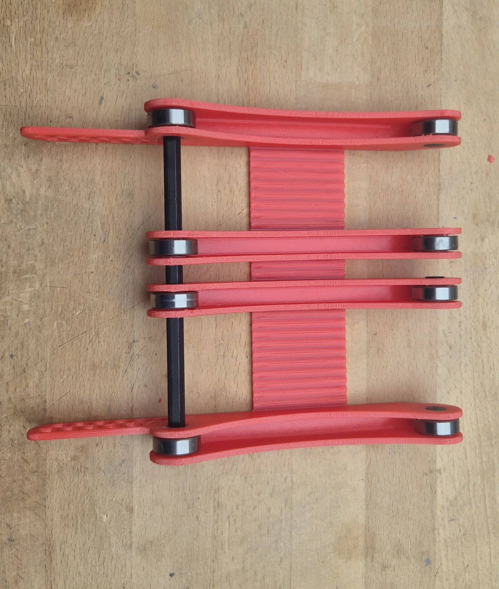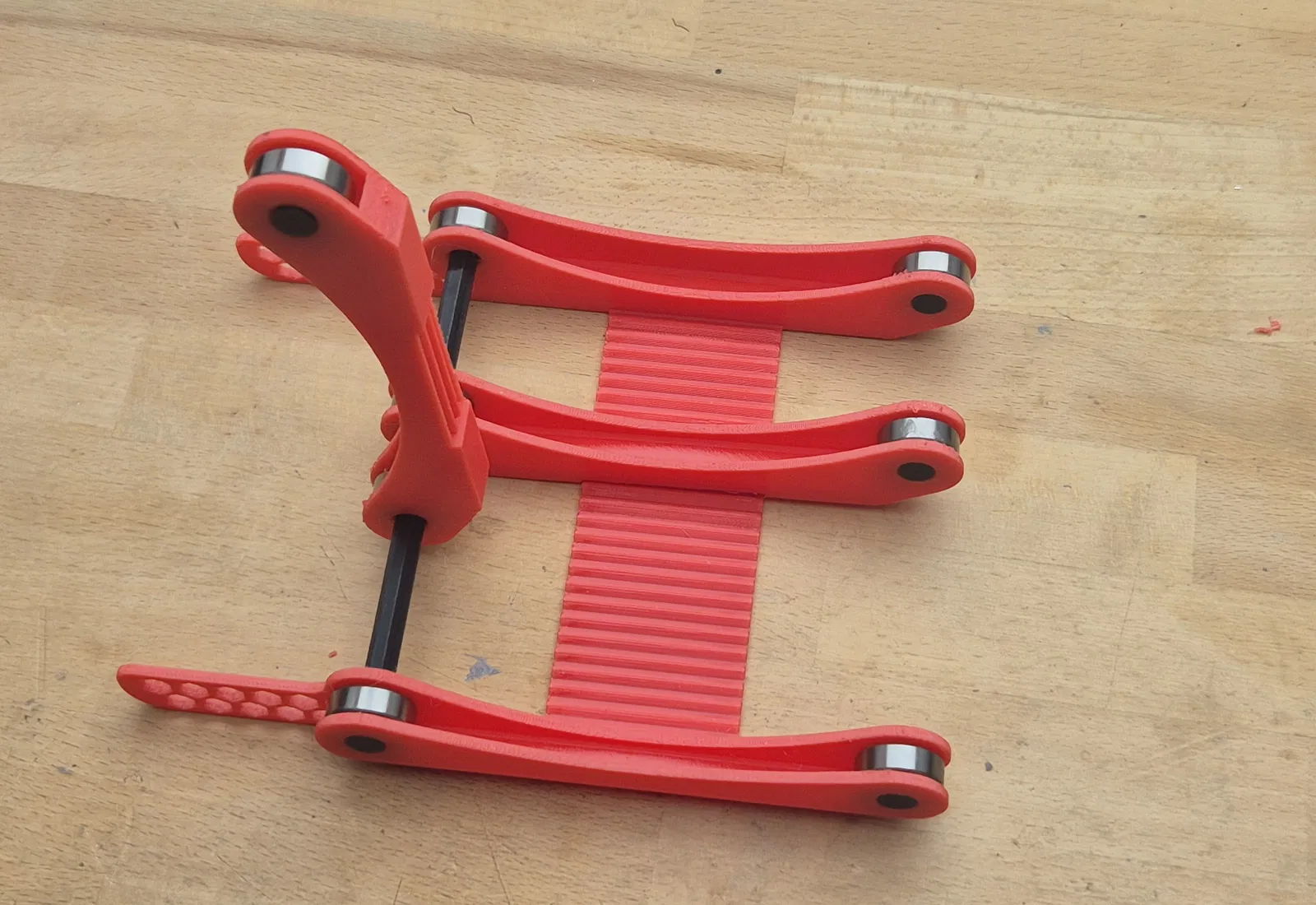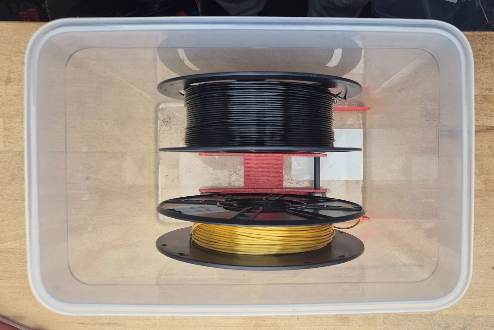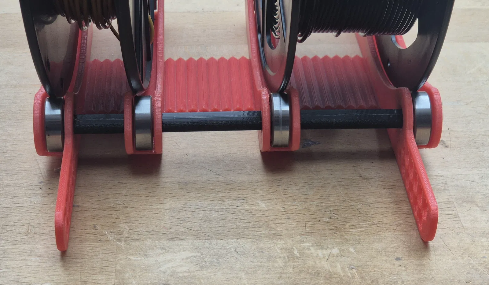 Thiết kế gốc có hai trục ngang với một phần giữa nối liền để dùng cho hai cuộn filament. Tuy nhiên, kiểu kết hợp này không cho phép dùng hai cuộn hẹp cùng lúc, vì bề rộng cuộn thứ hai phụ thuộc vào bề rộng cuộn thứ nhất. Vì vậy mình đã bỏ các trục và tách phần giá đỡ giữa thành hai cái riêng.