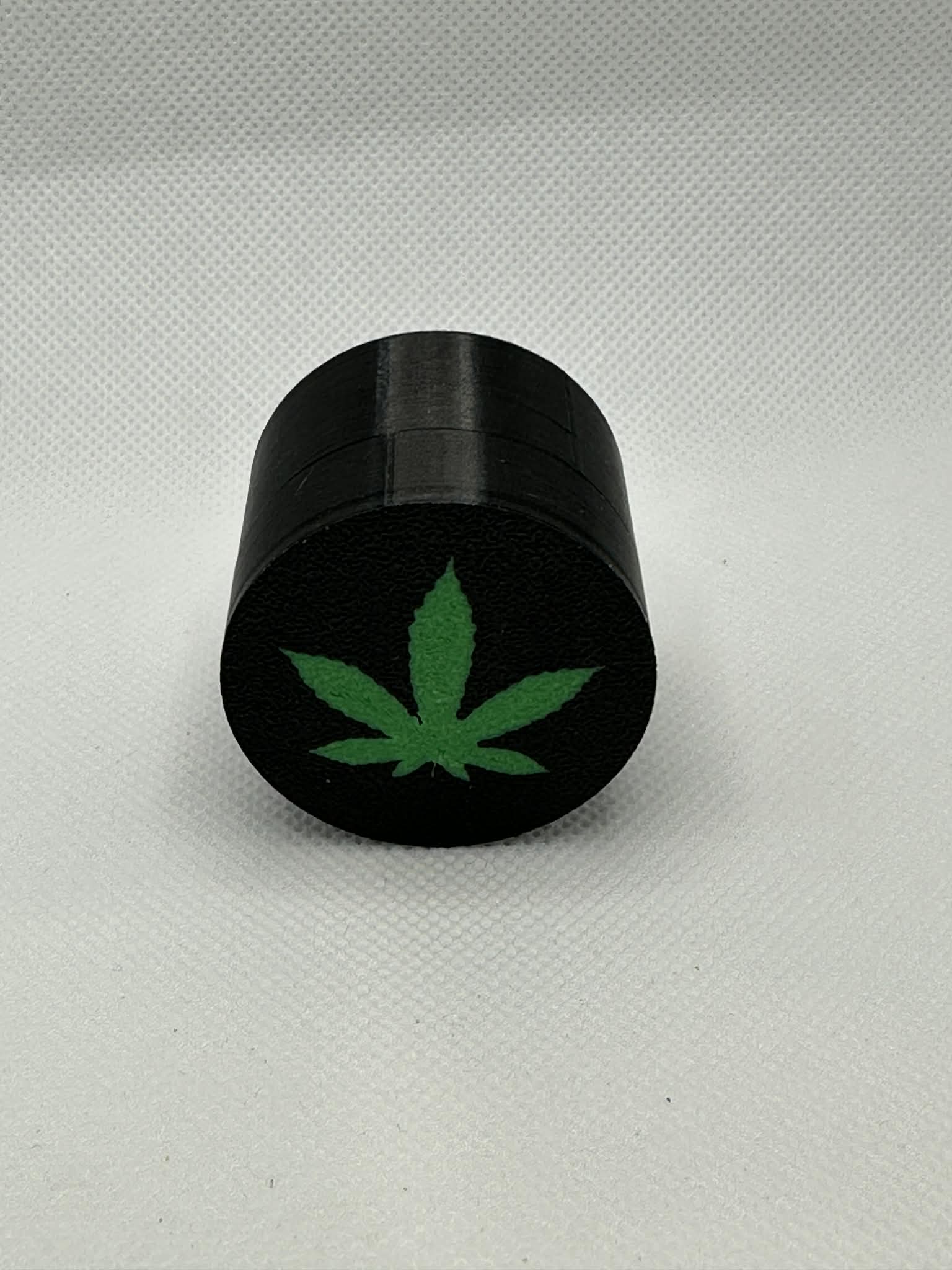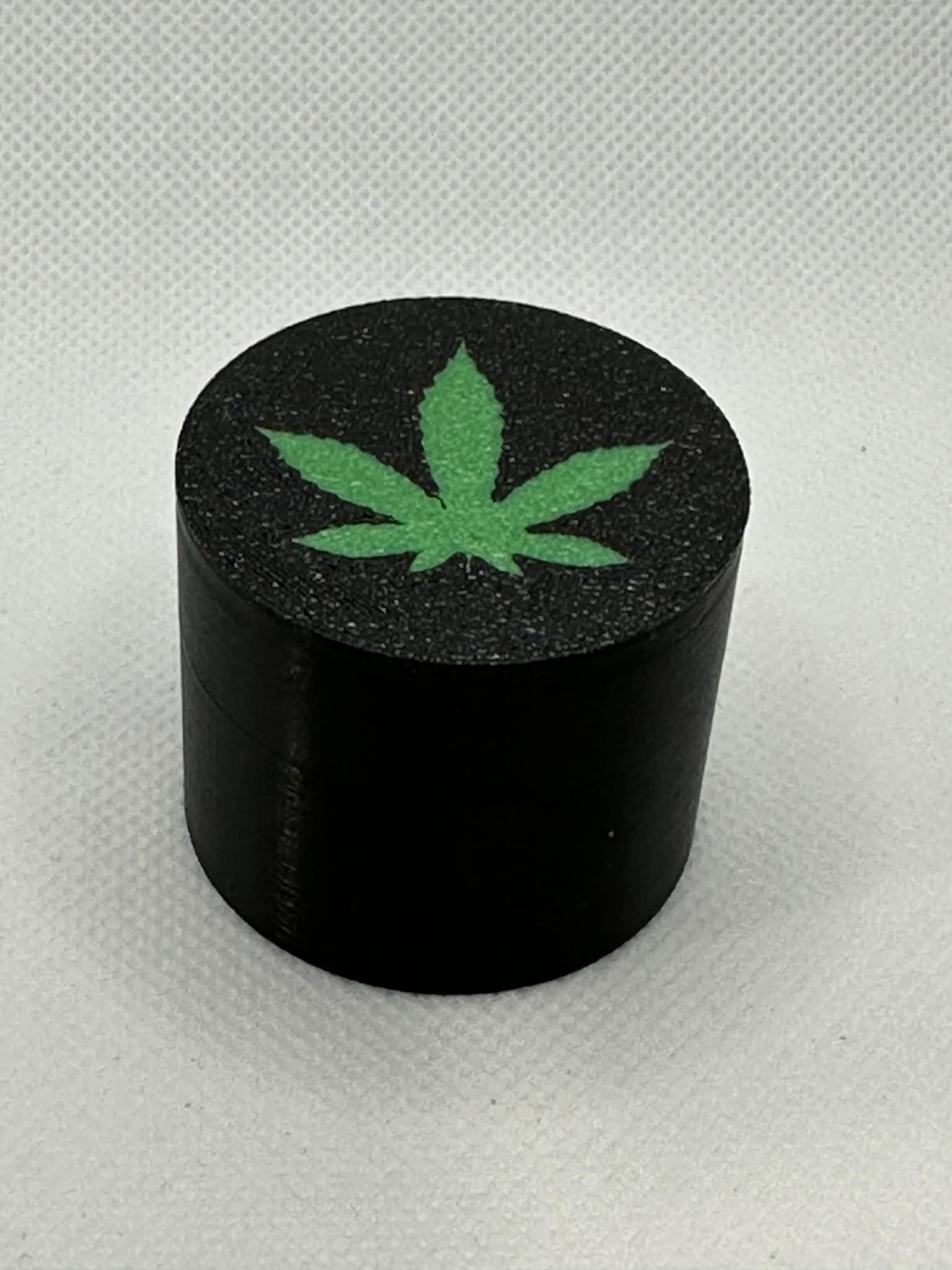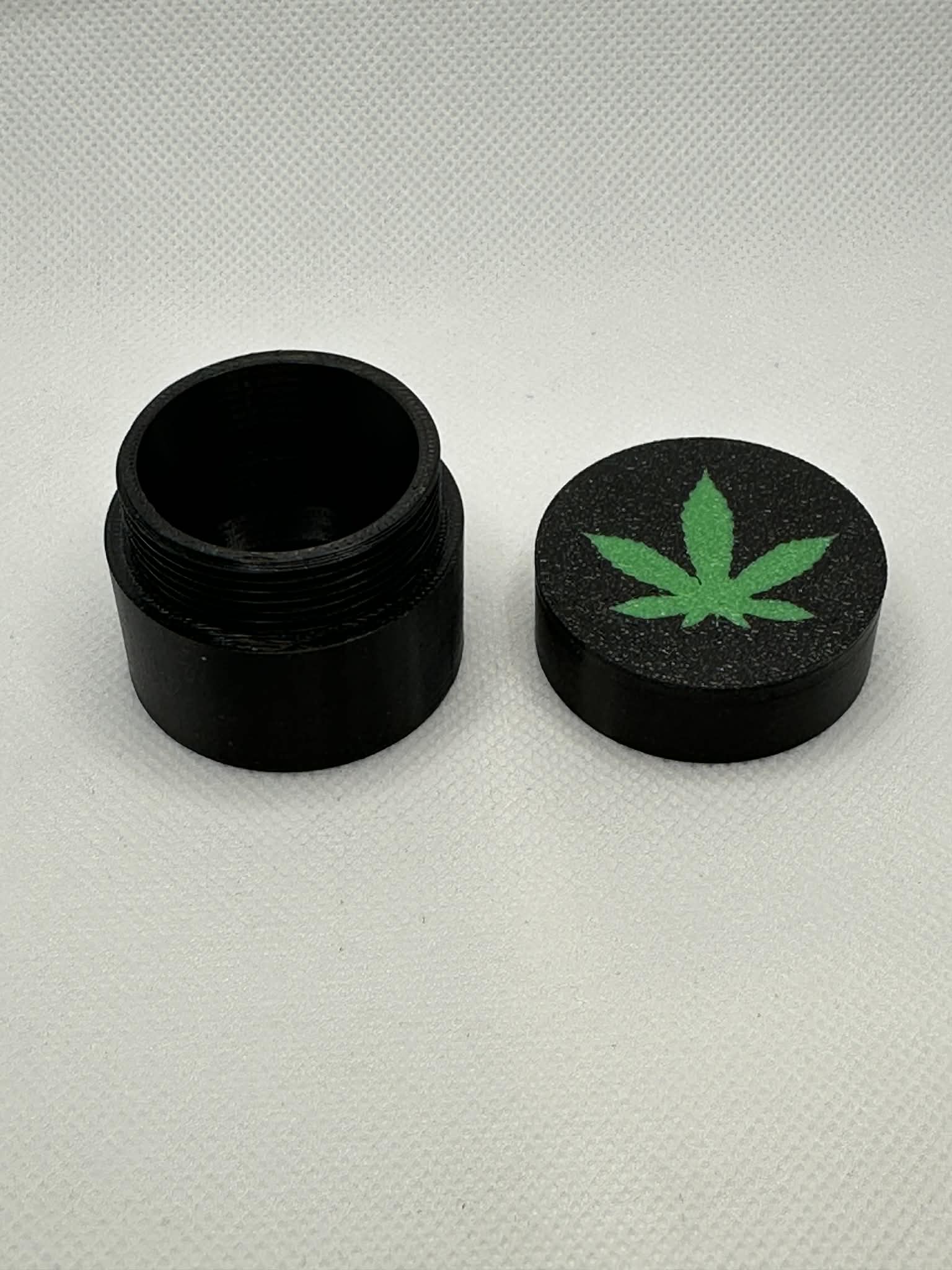 Hộp đựng in 3D này có nắp vặn chắc chắn, mặt trên dập nổi họa tiết lá cần sa nổi bật. Thiết kế vừa đẹp vừa tiện dụng, phần ren của nắp giúp vặn khít, tạo độ kín đáng tin cậy để bảo quản đồ bên trong an toàn.