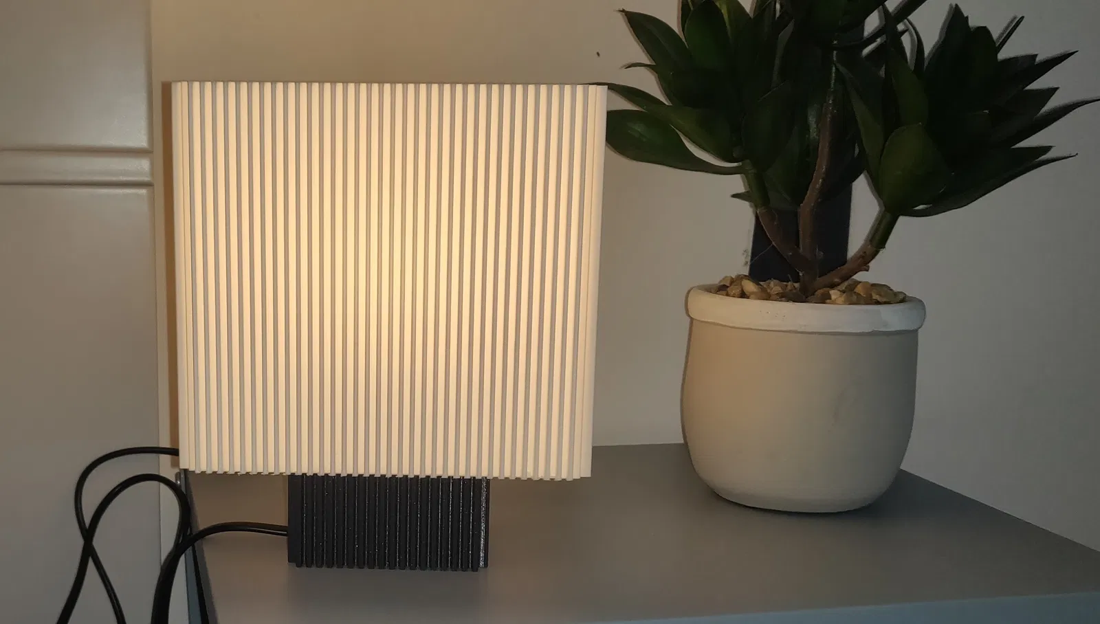 Phiên bản đèn bàn cube ribbed được scale xuống 75% để giảm thời gian in và hợp không gian nhỏ. Có thêm adapter cho bóng đui E14. Gợi ý tăng chiều cao đế 10–15 mm để đẹp hơn và tránh dây chạm đáy.