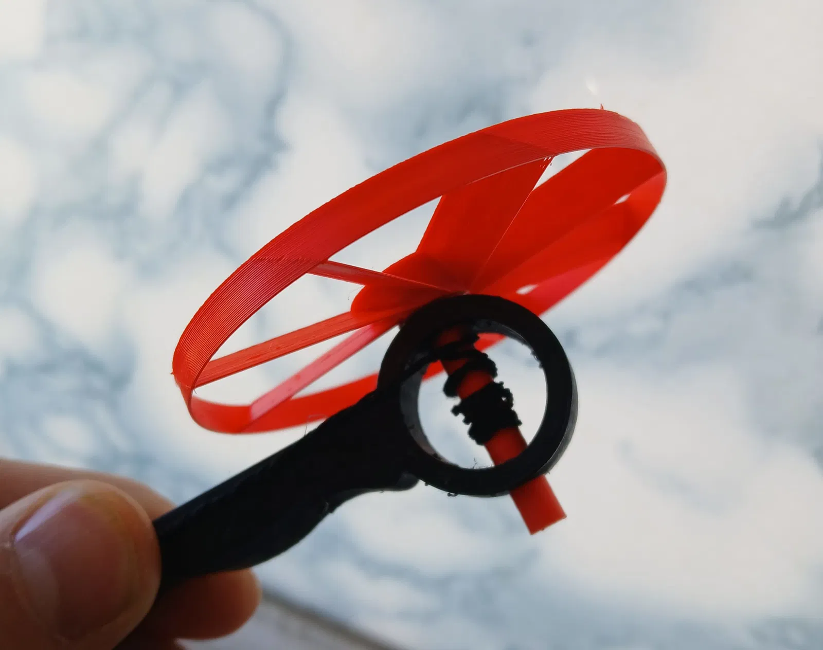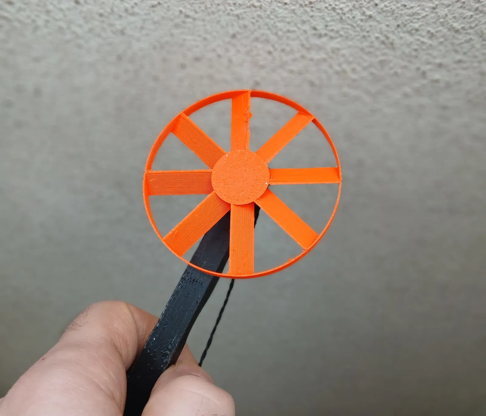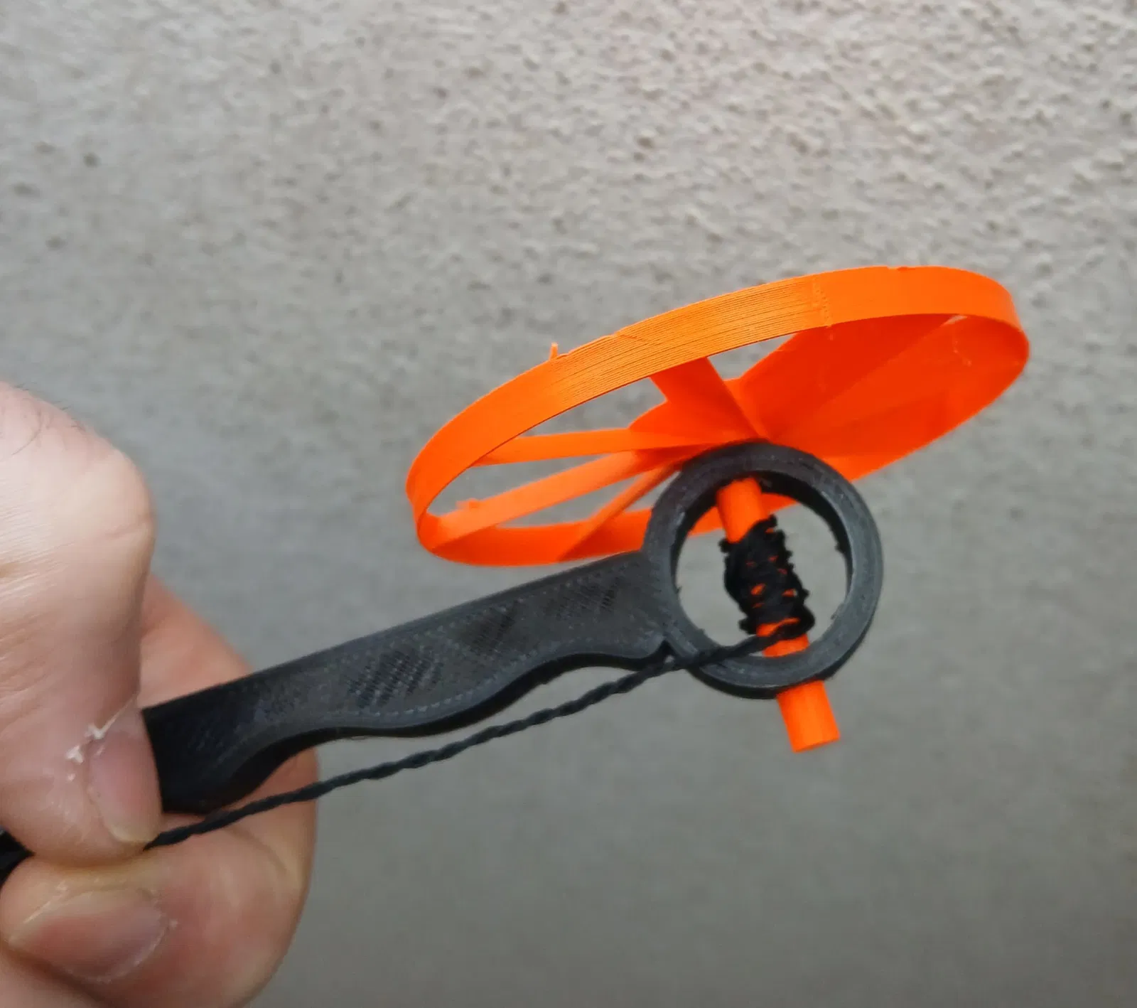 Mẫu pervane dùng cơ chế kéo dây: đặt cánh quạt vào tay cầm, luồn dây qua lỗ giữa, quấn rồi kéo để cánh quạt bay lên. Tác giả khuyên in bằng PETG và dùng ngoài trời.